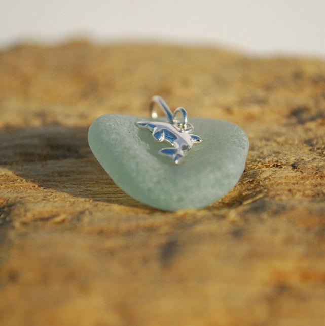 This is a special piece of sea glass because it is a lovely aquamarine colour and a curved shape. The little sterling silver dolphin is cradled by the glass, which has come from an old bottle.