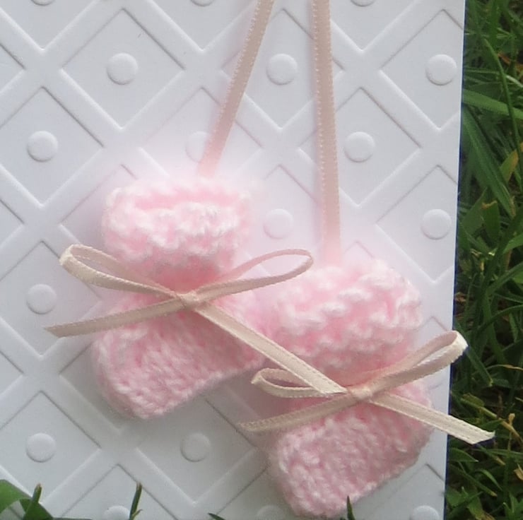 Finished with hand knitted baby boots, and finished with satin ribbon,and pearls, and placed upon and embossed background.