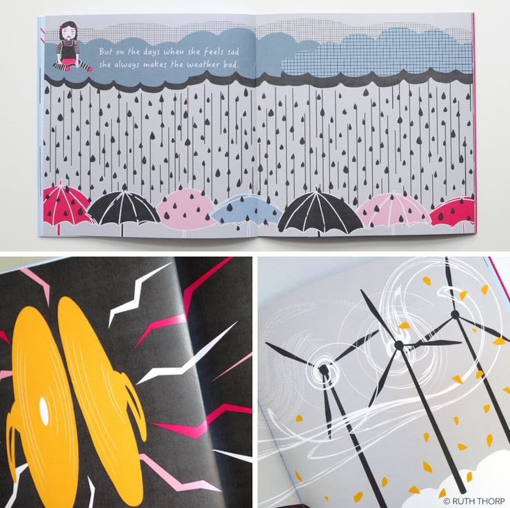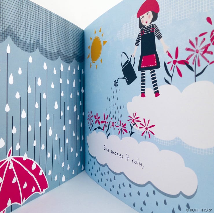 Inspiration for the Lilly Mae character came from Sarah's daughter (now 6) who was a tiny baby and from a collection of card designs Ruth had been working on. Sarah remembers seeing the little figure figure with an umbrella on one of the cards: