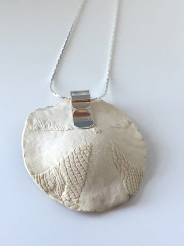 The porcelain disc measures 3.4x3.6cm and hangs from a silver tube bail and chain.