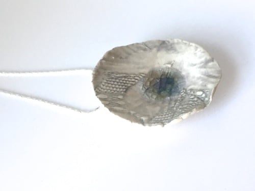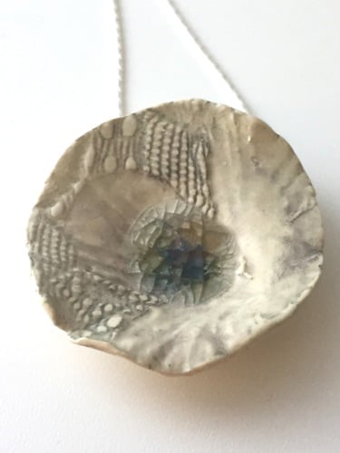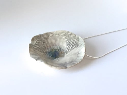 A textural ceramic necklace hand shaped with love and fired twice with a wash of slate blue-grey glaze and glass.