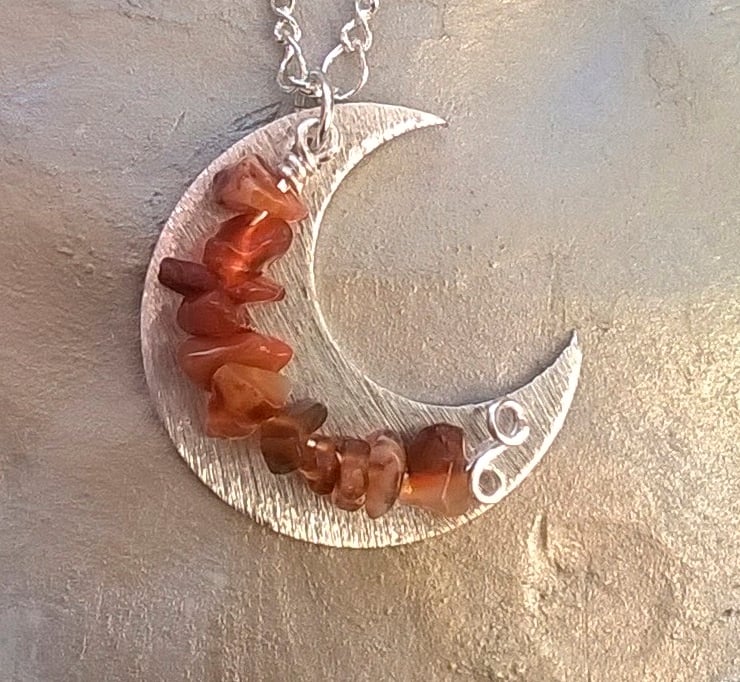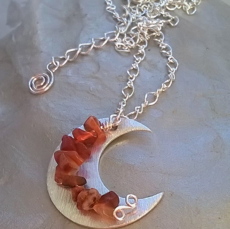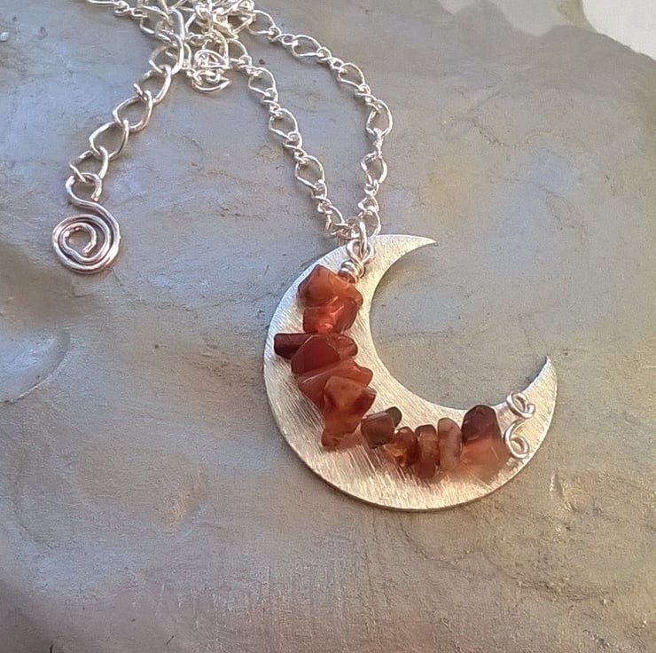 Semi-precious carnelian chips suspended in front of a brushed silver plated moon and carried on a 44cm silver plated figaro chain with a further 4cm of extender chain and finished with a silver plated lobster claw clasp.