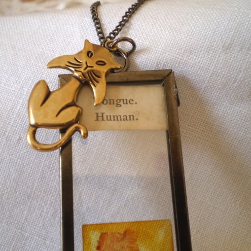 "Cat Got Your Tongue" vintage microscope slide pendant/necklace...I have created a quirky Gothic, pendant from a genine vintage microscope slide of a human tongue, which is a unique sample. A top section of glass protects it, as does the brass frame. A golden cat charm adds a "tongue in cheek" appeal. Measures 5.5 cms long and hangs from an 18 inch chain... certainly unusual.