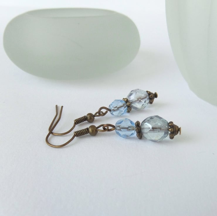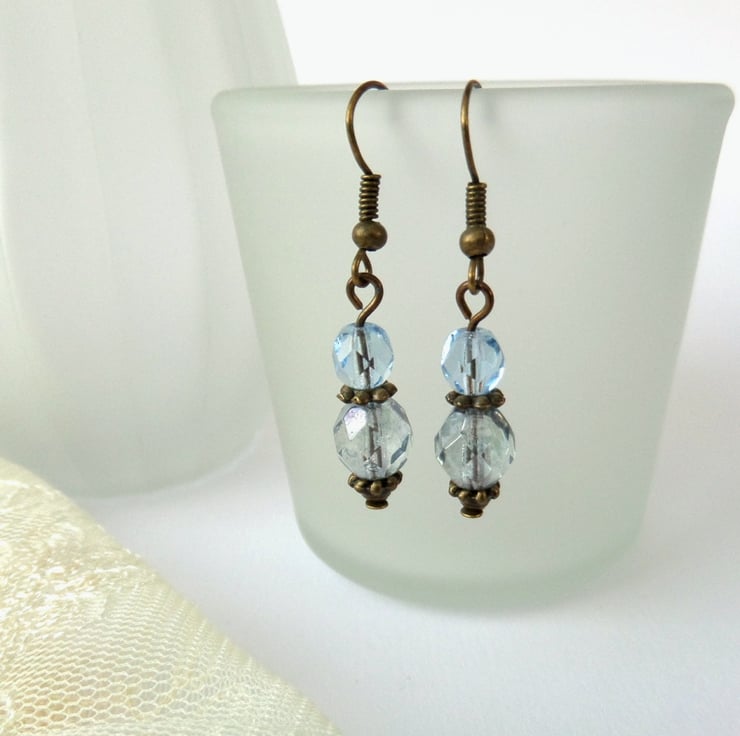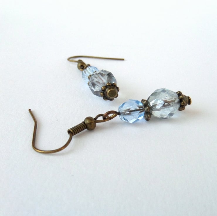 A unique pair of earrings, created with two shades of blue crystal hung on bronze wires.
