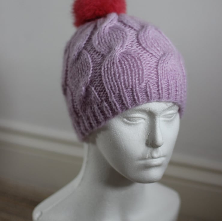 Hand knit women's Hat. Made from very soft yarn. 70% Angora 30% Acrylic. With real fur pink pompom.Washable at 30C.
