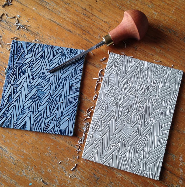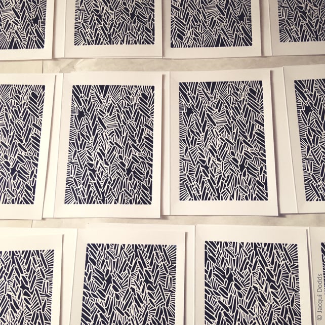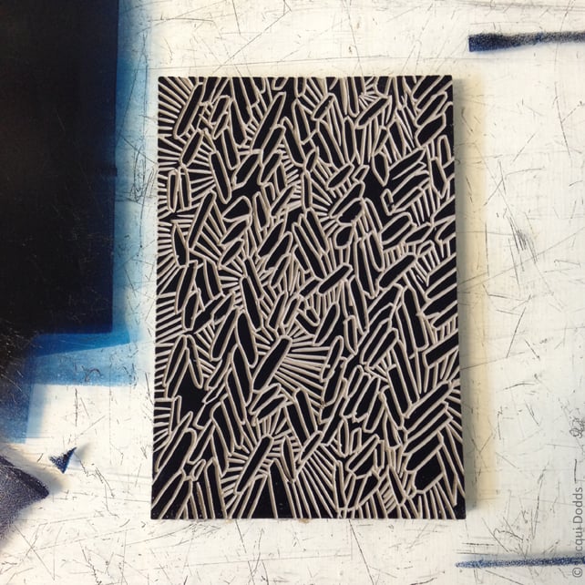 My Herringbone design is inspired by a Roman herringbone floor at Wroxeter Roman City in Shropshire. I have carefully carved the design into lino and then hand printed it in the studio.