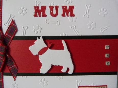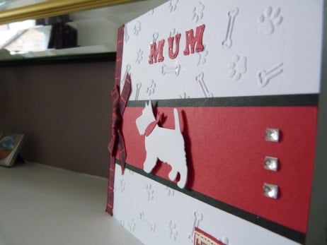 A completely handmade and uniquely designed card. A white west highland terrier die cut from quality white card with cute red bandana, mounted onto dark red card, black card and then onto quality pristine white card which has a design of paw prints and bones embossed. A with love piece of ribbon mounted onto red card highlights the bottom right corner. Further decorated with three crystal rhinestones and finished off with a red tartan ribbon and bow. The word MUM die cut from dark red card finishes off the top of the card
