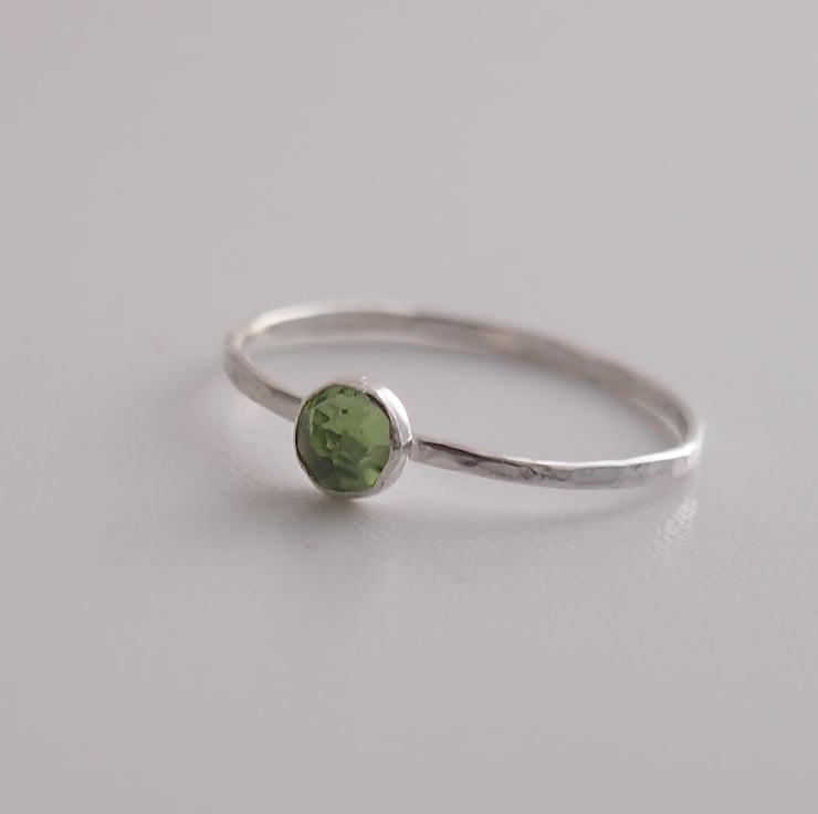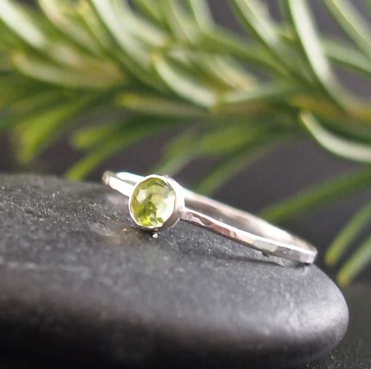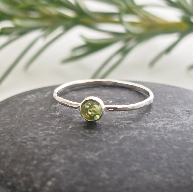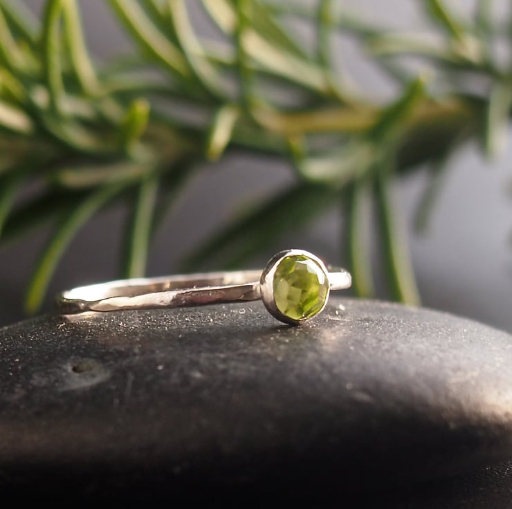 One of our delicate skinny rings hammered for texture with a bezel set peridot. The peridot is 4mm and rose cut for a beautiful sparkle. These are lovely quality stones specially imported by us.