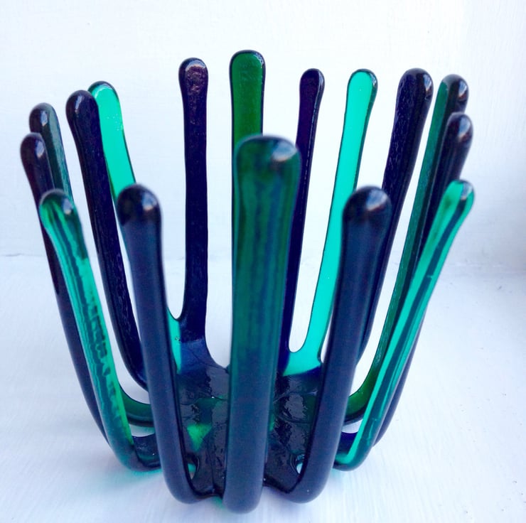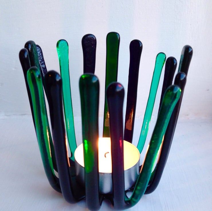 Unique fused glass candle holder in beautiful deep vilolet, sea green and teal green glass. Fused and slumped to 8cm high, and max 8cm wide.