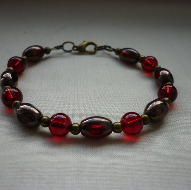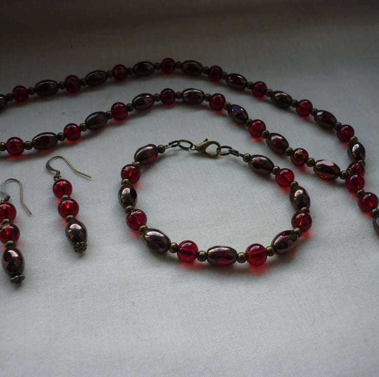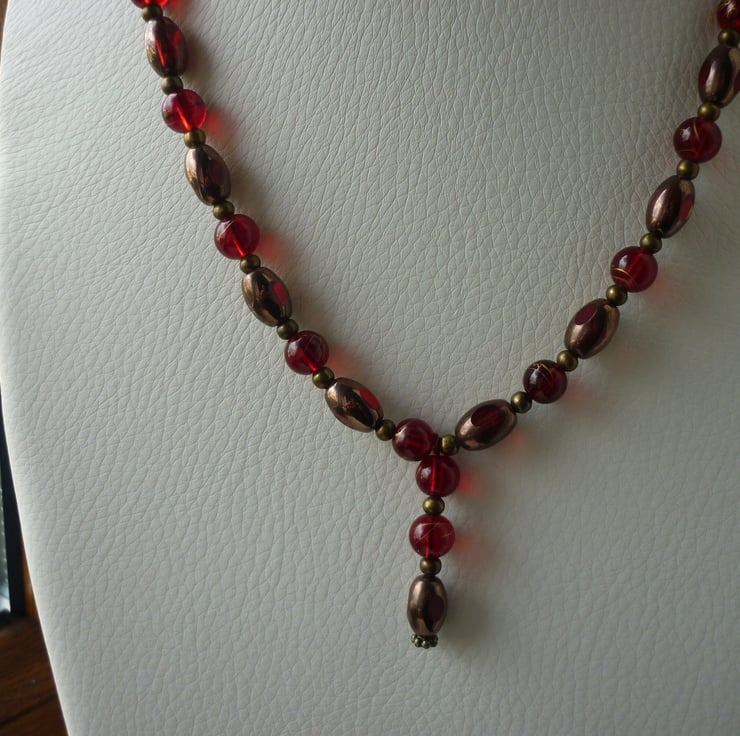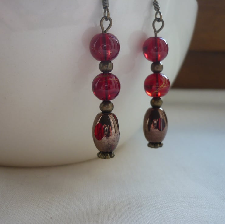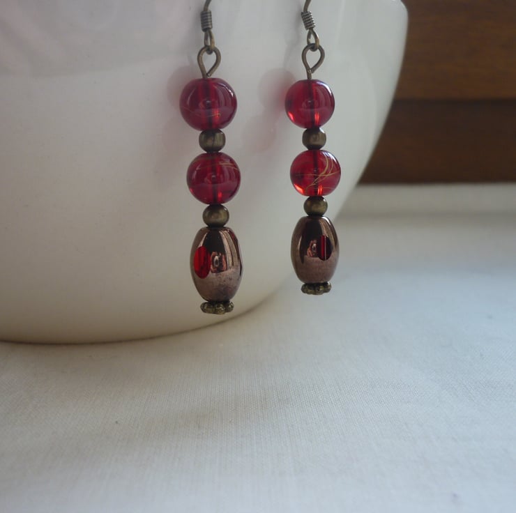 THE EARRINGS HAVE BEEN MADE USING RED GLASS AND BRONZE BEADS ALONG WITH BRONZE SMALL SPACER BEADS AND FINISHED WITH ANTIQUE BRONZE FISH HOOK EAR WIRES WHICH ARE NICKEL FREE.