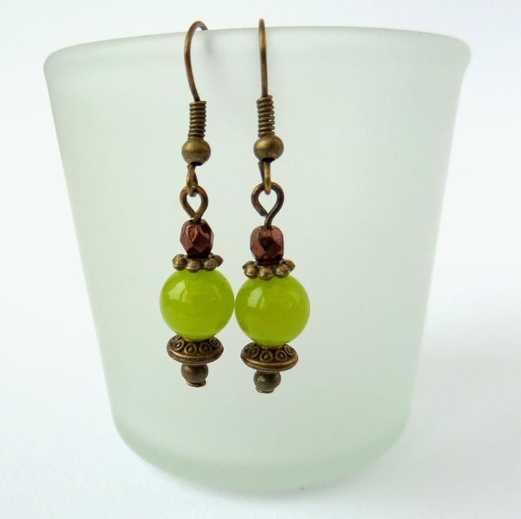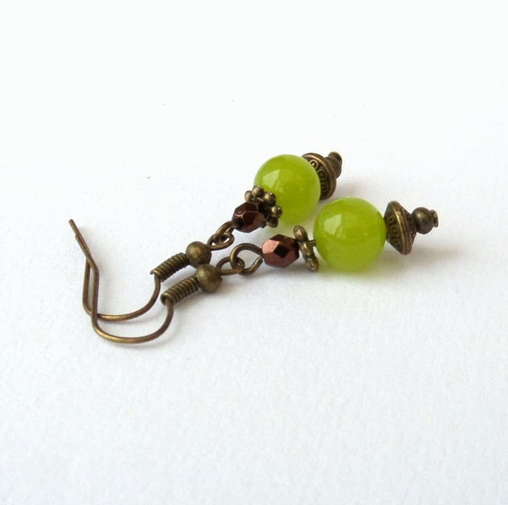 The peridot jade and rich brown crystal in these earrings look great together, and the addition of bronze wires completes this vintage inspired style perfectly.