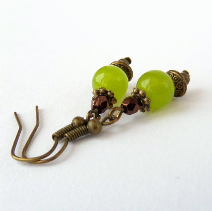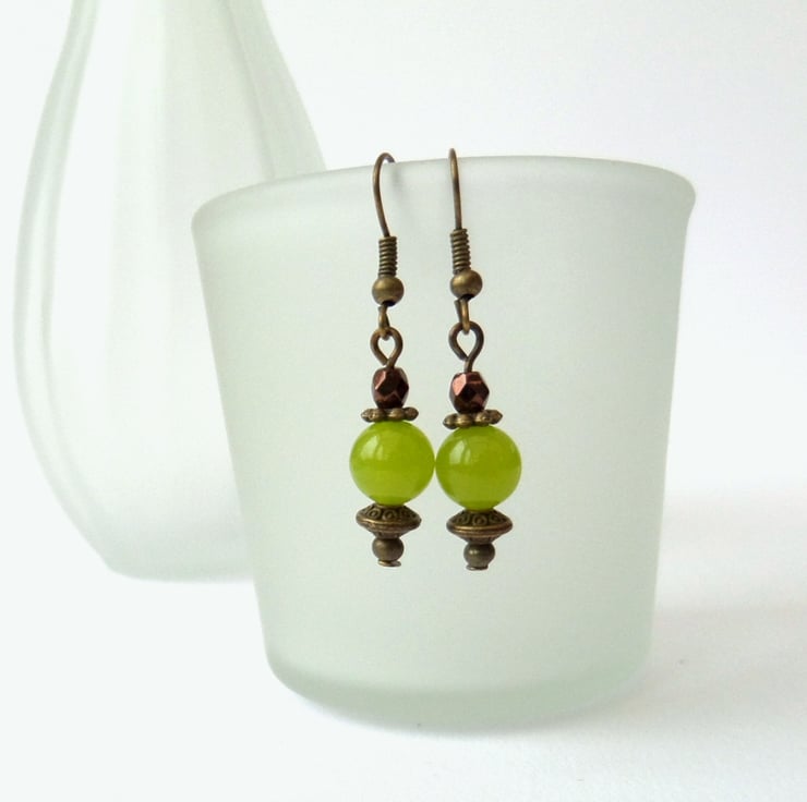 An unusual and unique pair of handmade bronze earrings with jade in a gorgeous vibrant shade of peridot green. The addition of smaller rich brown crystals and bronze rondelle and spacer beads completes these eye-catching earrings.