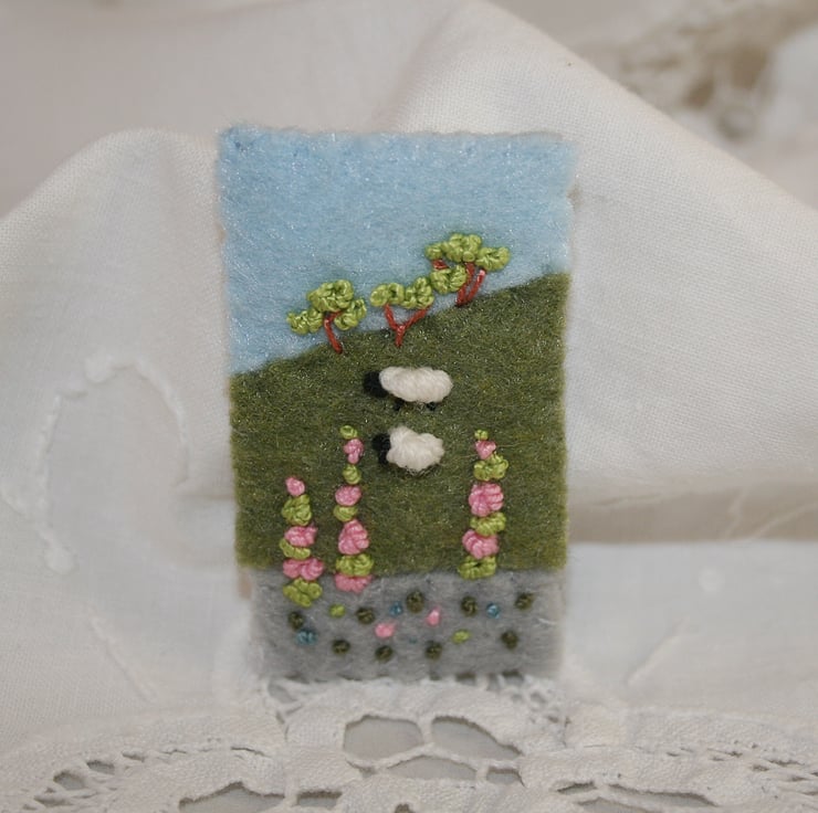 A fun brooch featuring tiny embroidered sheep, foxgloves and distant trees.