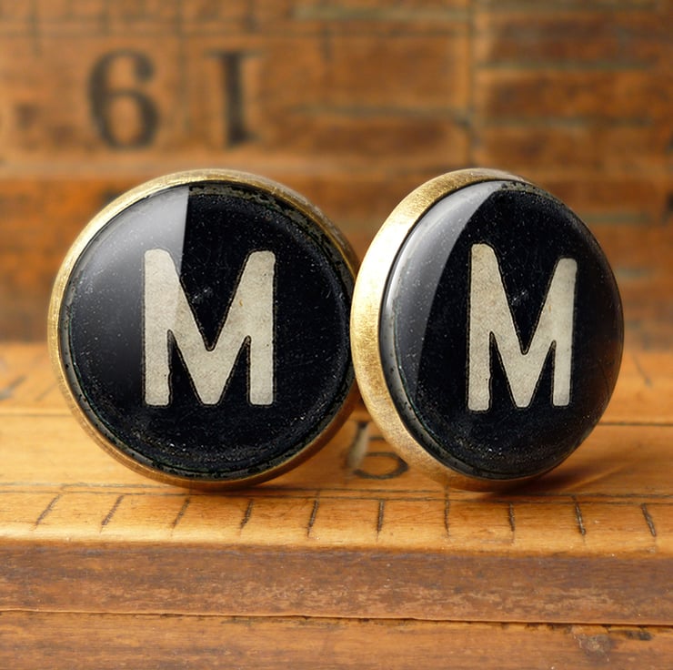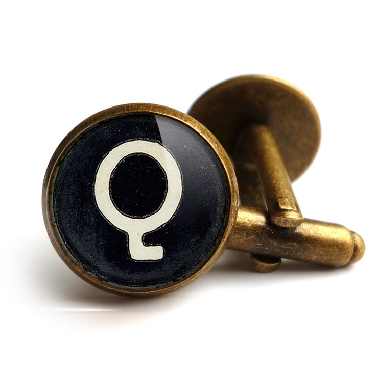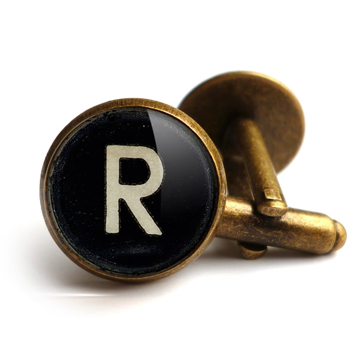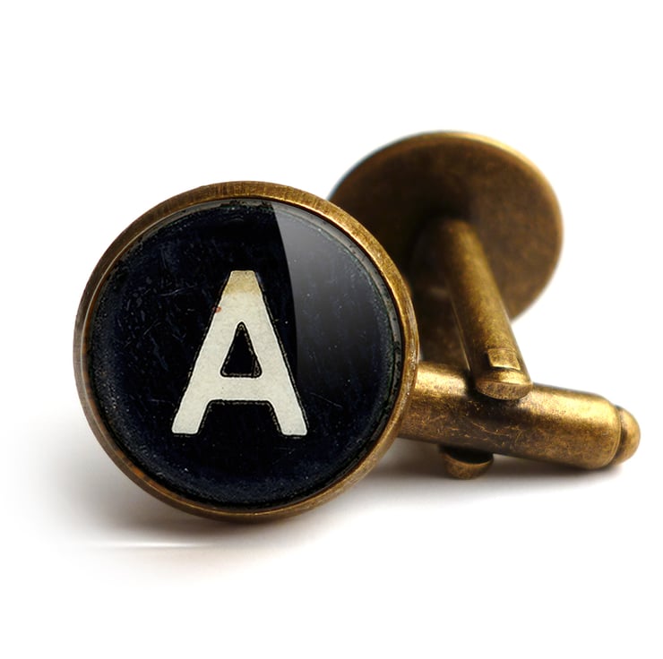 A beautiful pair of personalised alphabet cufflinks featuring a close-up photograph of a vintage typewriter key.