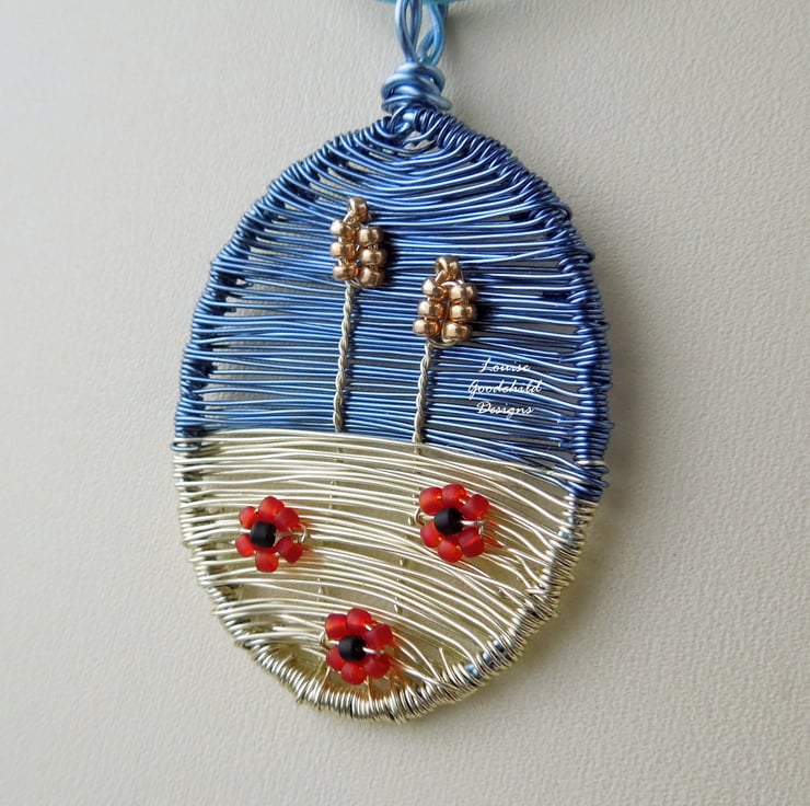 One of my smaller woven pendants, featuring the distinctive wire work style common in my larger pendants, including a woven wire backdrop. Made entirely from high quality coloured copper wire, with a glass seed beads, this pendant depicts ears of golden corn against a vibrant blue sky, with poppies red against the cornfield.