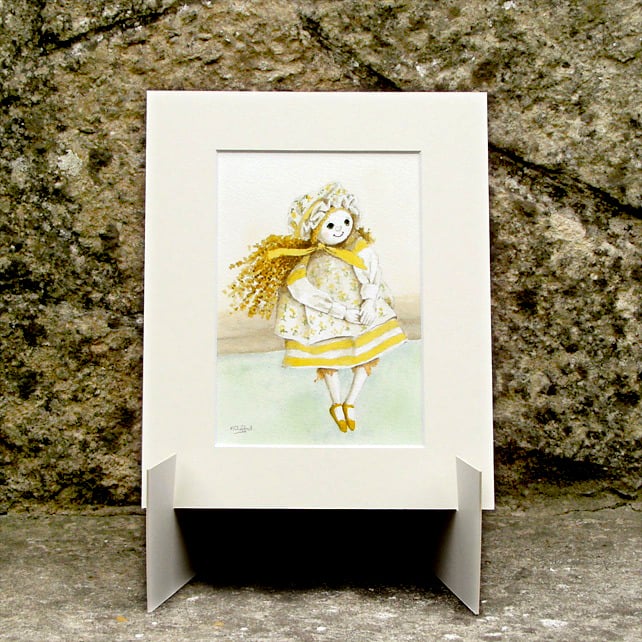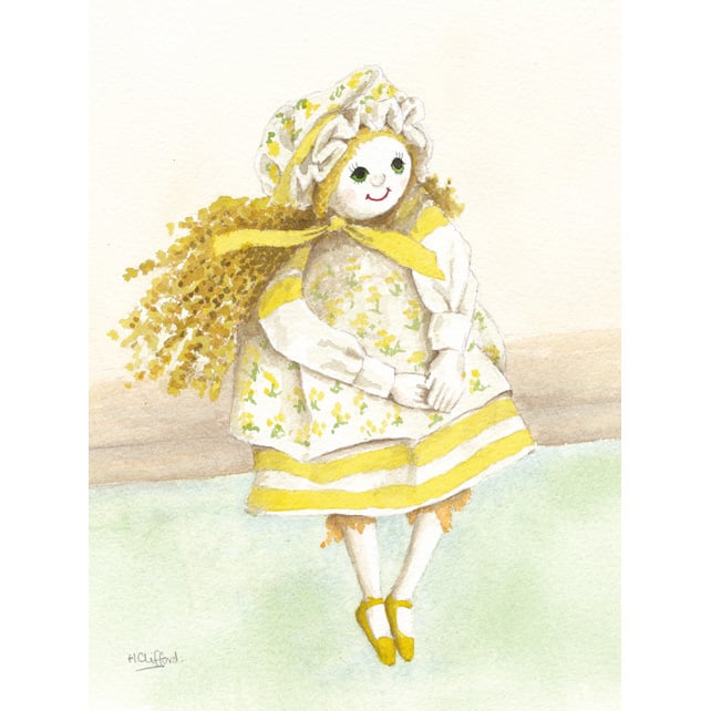This is a unique original watercolour painting of Gillian, an old-fashioned little girl doll. Dressed in yellow flowered smock with striped petticoat and a peep of lacy bloomers, with her long curly hair held under a mob-cap, she has big green eyes and a lovely smile under her little button nose. This is a delightful small picture, ideal for a child's bedroom or nursery, and could inspire many bedtime stories. It would make a perfect christening or new baby gift.