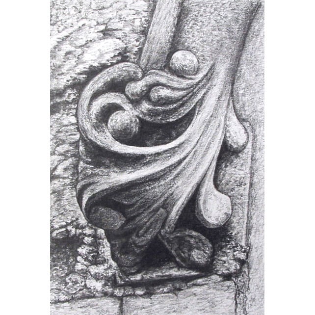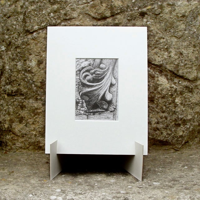 This is a unique original graphite pencil drawing of a carved stone boss located on the wall of an ancient church. The small architectural details of old buildings are often intricate and beautiful. Much time and craftsmanship has been spent carving these complex details, which can so easily be overlooked. This little drawing focuses in on one intricate example.