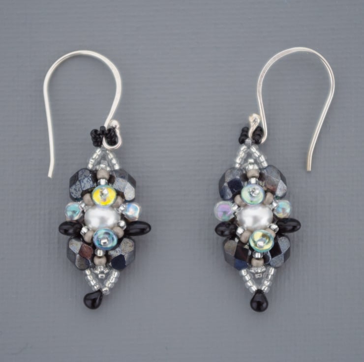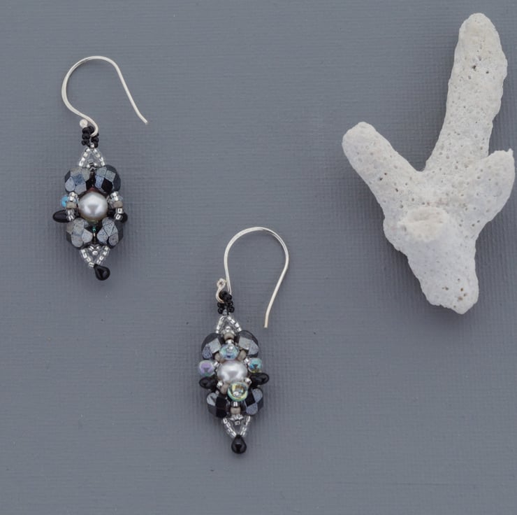 These intricate handmade bead-work earrings are made using dozens of tiny glass beads, Swarovski pearls and fire-polished Czech glass. The colours are a combination of black, white and fashionable haematite grey some with sparkling iridescent finishes. This design uses many different shapes of beads to create an interesting texture like that you might find in a natural crystal formation. I string them by hand using a fine needle and extremely strong waxed nylon thread. This specialist beading thread uses up-to the minute technology to give them body and stiffness as well as making them extremely robust. The technique is a little like 3D embroidery. They are an elegant 50 mm or 2" in length and mounted on hand-made ear wires I made from sterling silver in my West Sussex workshop.