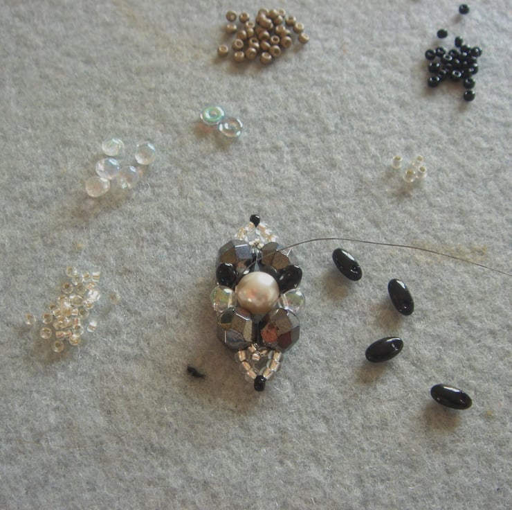 I was very interested to see the pictures taken from the surface of a comet recently. They formed a jumble of hard, angular, crystalline shapes in dark reflective colours. I created these bead-work clusters to appear like naturally formed ice crystals in the intense cold of deep space but with smooth pearl centres, as if they had been melted in the heat of the sun. I set these in a marquise shape, which is one I particularly like because it reminds me of the era of Art Deco, where the monochrome palette and hard angular patterns were all the rage.