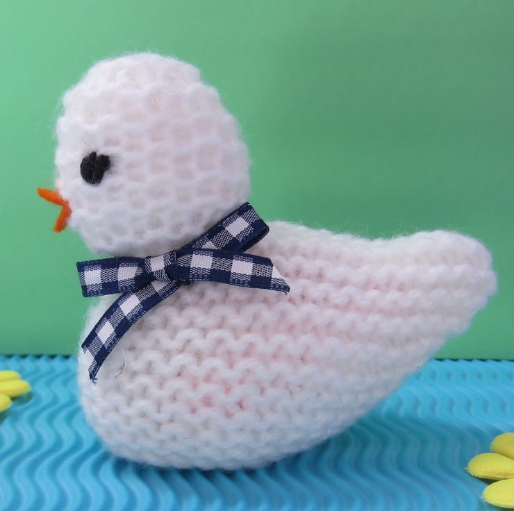 Little hand knitted Easter chick with opening at bottom to use to hide a small egg such as a Cadbury's Cream Egg. Could also be used as an egg cosy. Chick measures 8.5 cm wide and 9 cm high.