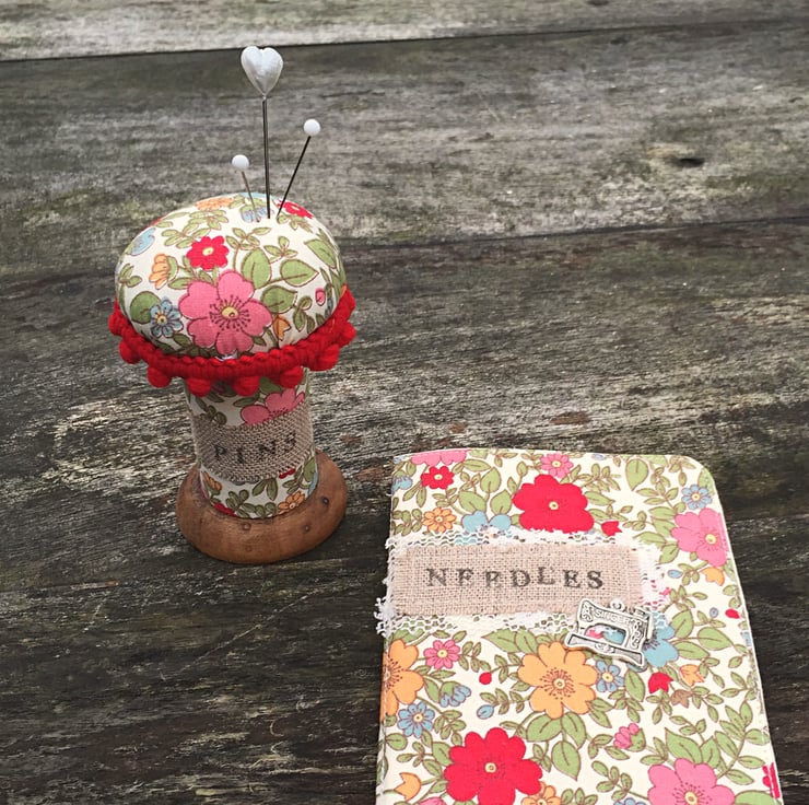 Wooden spool with vintage style floral fabric and cute little pom pom trim - includes pins! 8cm tall plus pins.