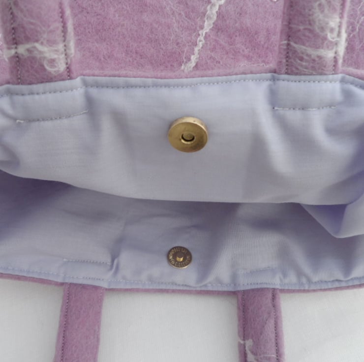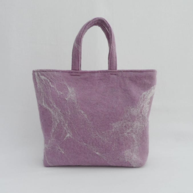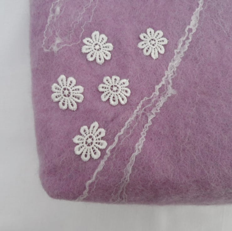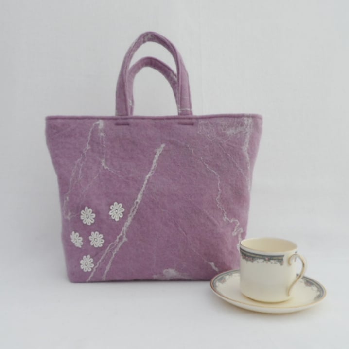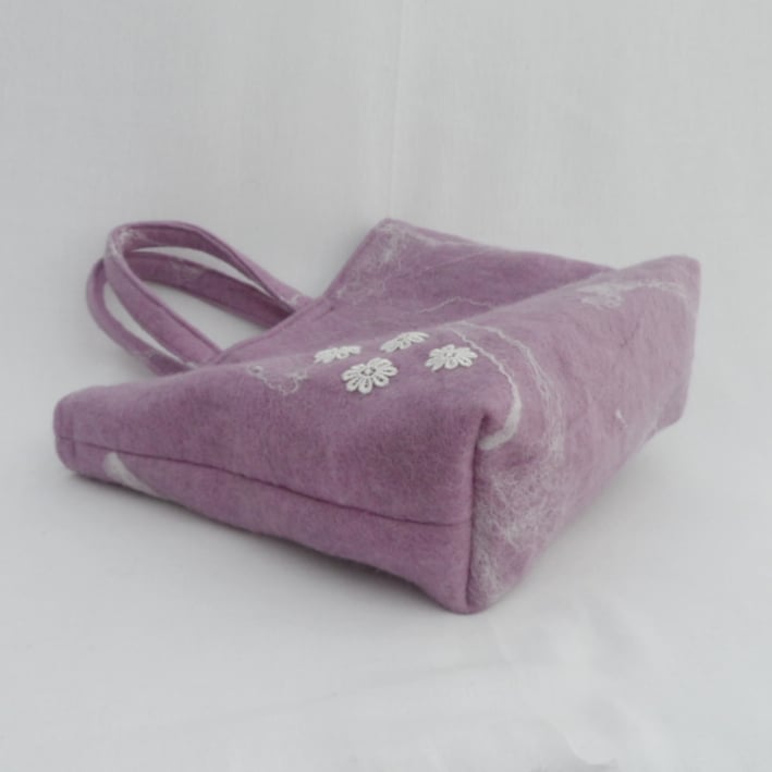 Get set for spring and summer with this gorgeous lilac felted handbag. Made using a nuno felting technique, lilac NZ perendale wool overlaid with white silk fibres has been felted onto cotton muslin and fashioned into this handbag. It is lined with pale purple polycotton fabric and has five pretty daisies sewn to the front. Medium weight interfacing adds structure to the bag preserving its shape, and a card base covered in lining fabric prevents sagging of the bag if heavy items are placed in it. The bag measures 13.5"(34cm) across the top with a height of 13.5"(24cm) and a rectangular base measuring 9.5"(24cm) x 4"(10cm).