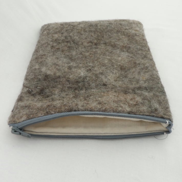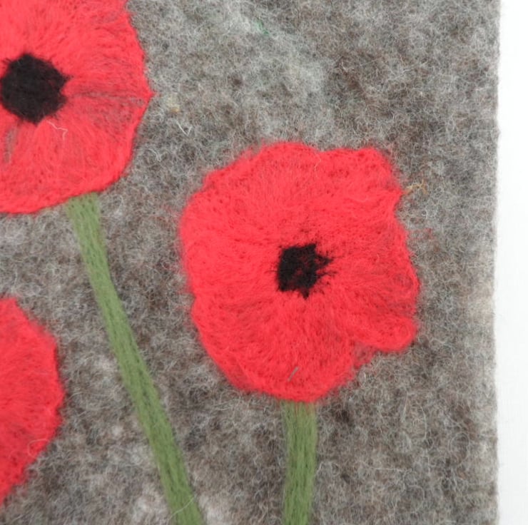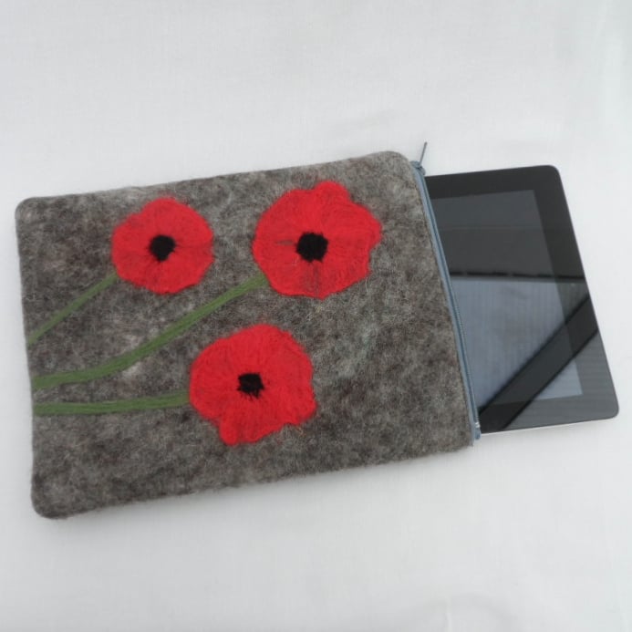 Treat your iPad/tablet to a new home! This iPad case has been made using a nuno felting technique with grey Jacob wool on a cotton muslin base. Three large poppies have been needle felted to the front surface using merino wool and a zip closure has been added. The case is lightly padded and lined with a cream coloured calico cotton fabric. The reverse side is plain grey felt. The external dimensions of the case are 10.5"(26.5cm) x 8.5"(21.5cm). Suitable for iPad 2 and other similar sized tablets.