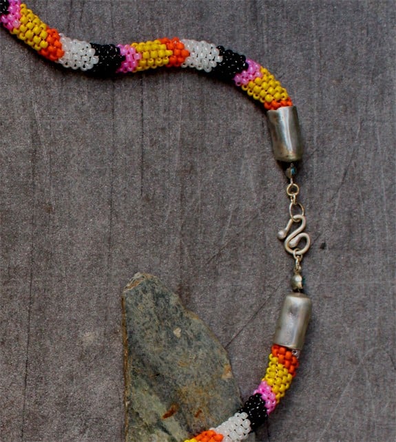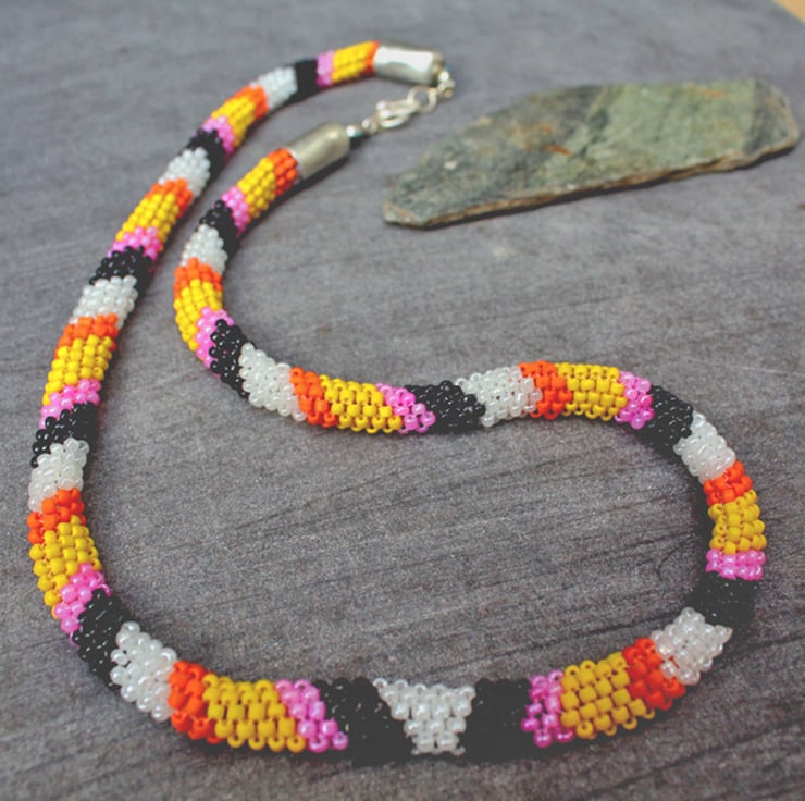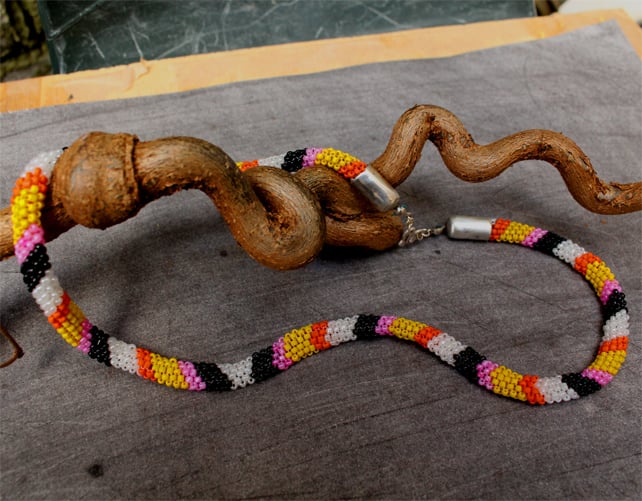Vibrant, tuneful, exciting and dynamic, this necklace is a sophisticated piece of beadwork in the tubular peyote fashion. It is 53cm (21") long and is tastefully finished with silver end caps and swirley hook.
