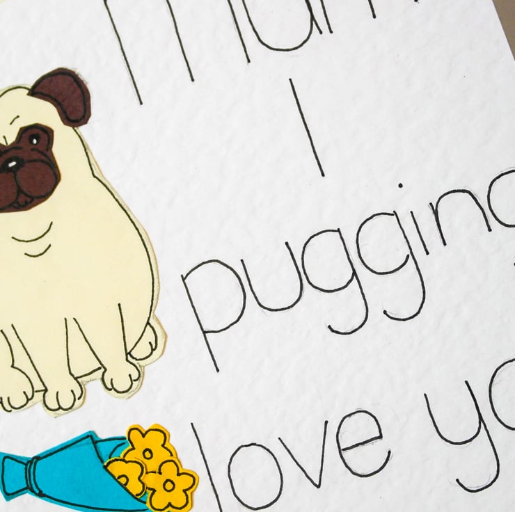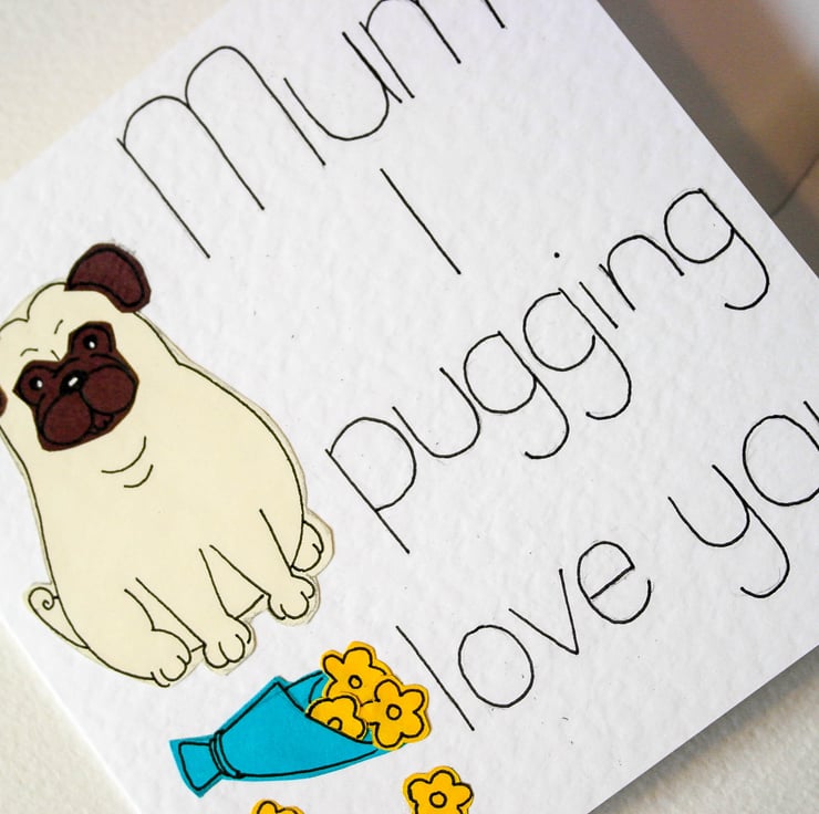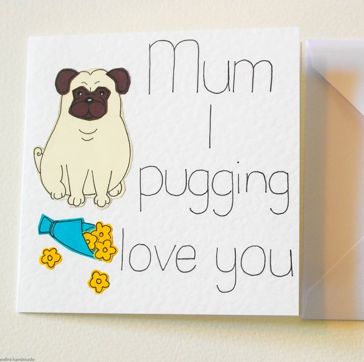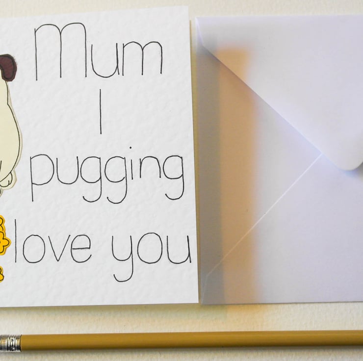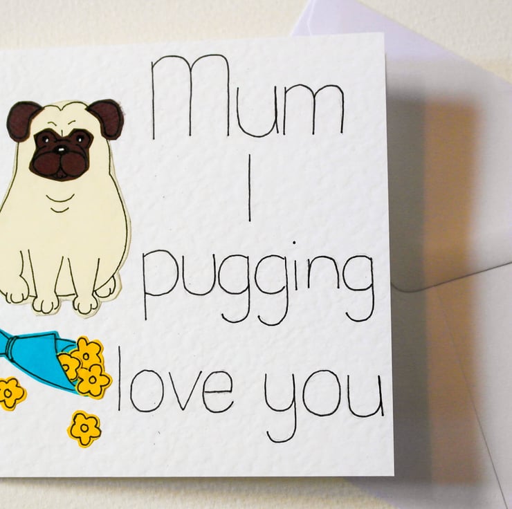 Go on tell your Mum you pugging love her. This funny, cute card will make your Mum smile and also show how much you love her. This card is great for a pug lover or any animal person.