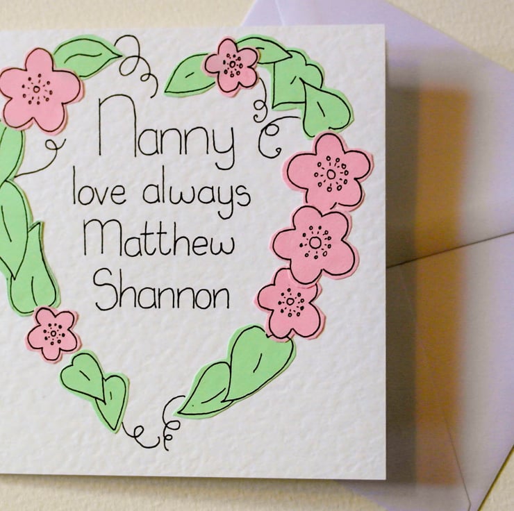 A handmade card to send to your Nanny on her special day, be it her birthday, Mother's Day or just to make her feel special. Flowers that last forever and you could put it in a frame to make a great gift. This card is all the more special and unique because it is personalised. Please add a note when ordering to tell me what message you would like on the front, it could be for anyone I can add any name.