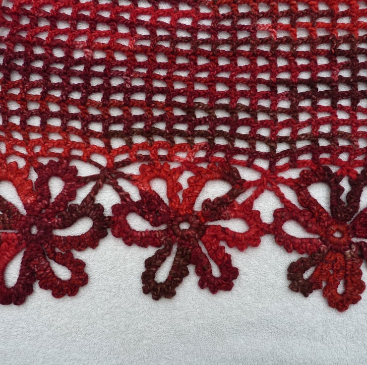 I have designed and crocheted this beautiful scarf from a chunky weight acrylic yarn. There are flower borders at either end, with a chain mesh stitch for the body of the scarf.