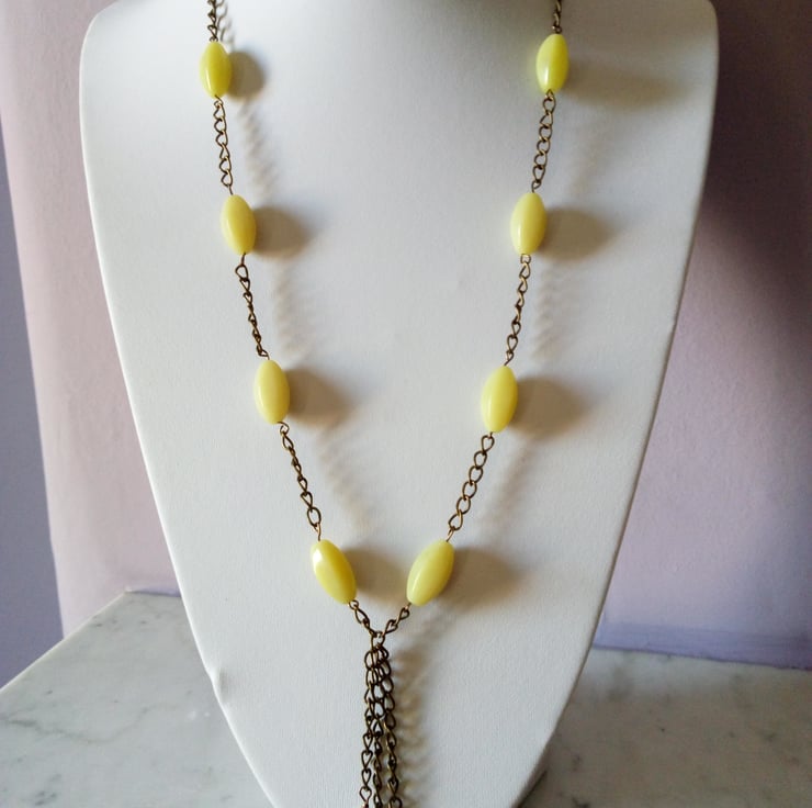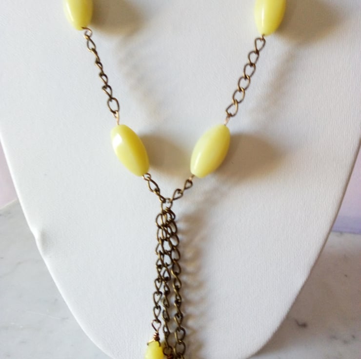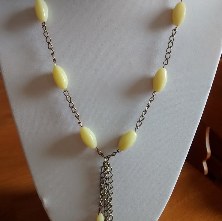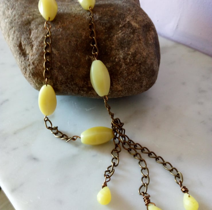 A BEAUTIFUL LONG 25 1/2 INCHES NECKLACE MADE WITH OLIVE JADE FACETED BEADS AND BRONZE CHAIN