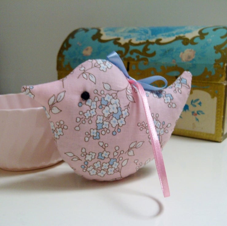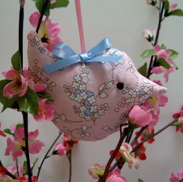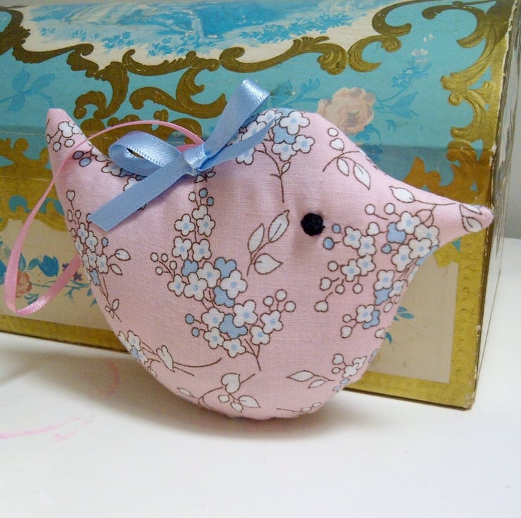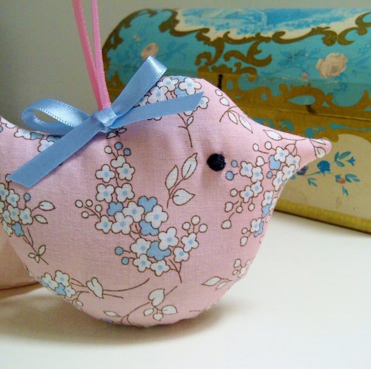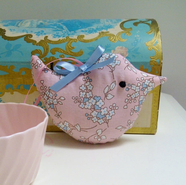 This mini lavender bird in a pretty, pale pink blossom cotton fabric makes a sweet little birthday. thank you or Mother's Day present. Designed to hang in a wardrobe to scent and freshen clothes, it makes a pretty addition to room decor.