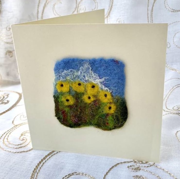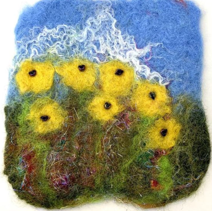 Miniature picture of daffodils in a field made with a mixture of needle felting and wet felting techniques and using beautiful soft merino wool. Little variegated beads have been stitched on afterwards.