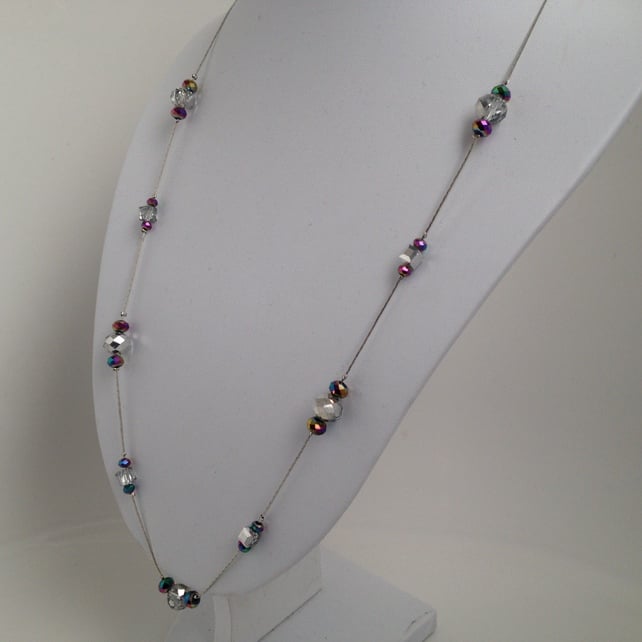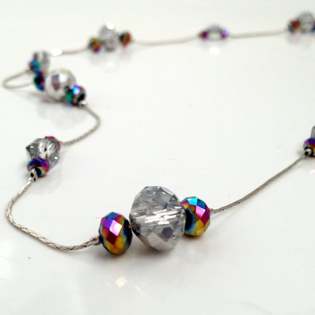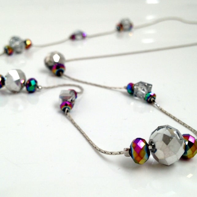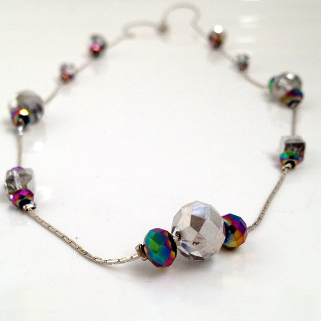 This subtle yet eye-catching piece has been created by crimping sections of crystal rondelles and cubes onto a length of silver plated snake chain. Each beaded section has been spaced approximately 1.5 inches apart which is what gives this necklace its delicate sparkle.