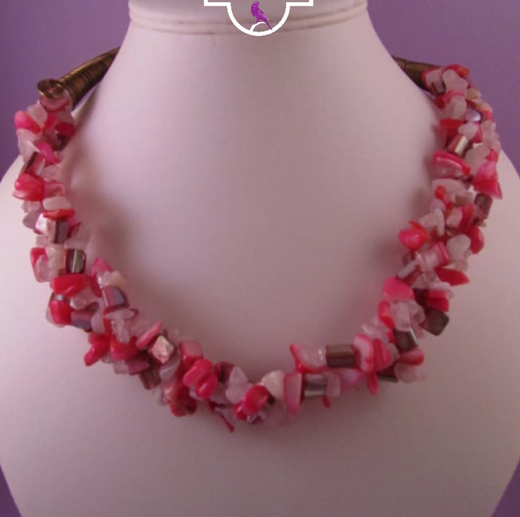 This is a gorgeous pink shell, rose quartz short necklace. It is created with real pink shell, real rose quartz gemstones, real rubellite gemstones, and antique bronze e-coated copper wire. It is a stunning piece of jewellery that is very comfortable to wear.
