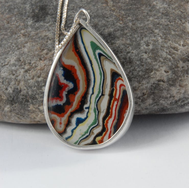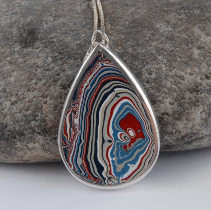 This pendant features a piece of vintage fordite (believed to be from the Dagenham factory in the 60's/ 70's) with a swirling pattern in shades of blue, red, white and grey which has been bezel set in silver. The design has an open back as the pattern on the fordite is different - the back has stripes of off white, green, orange, beige and navy. Some of the paint layers on both the front and back are sparkly.