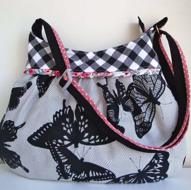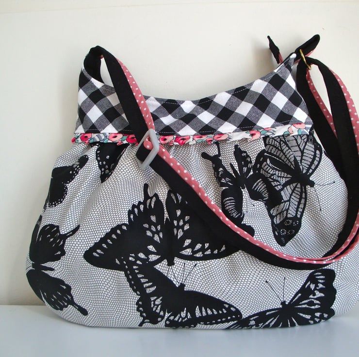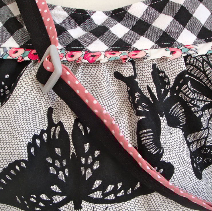 Handmade in two lovely cotton fabrics , one featuring black butterflies and the other is a black/white gingham fabric . A lovely pleated cotton trim has been inserted in yoke seams , front and back .