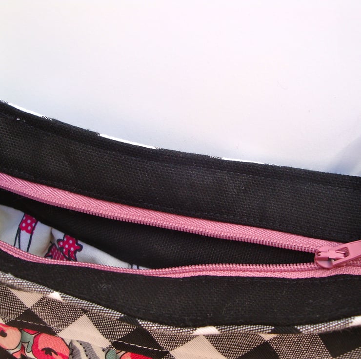Closure is a pink zip across the top . Strap is adjustable , and can be worn Crossbody or on shoulder , and is made in a black canvas and a pink polkadot fabric.
