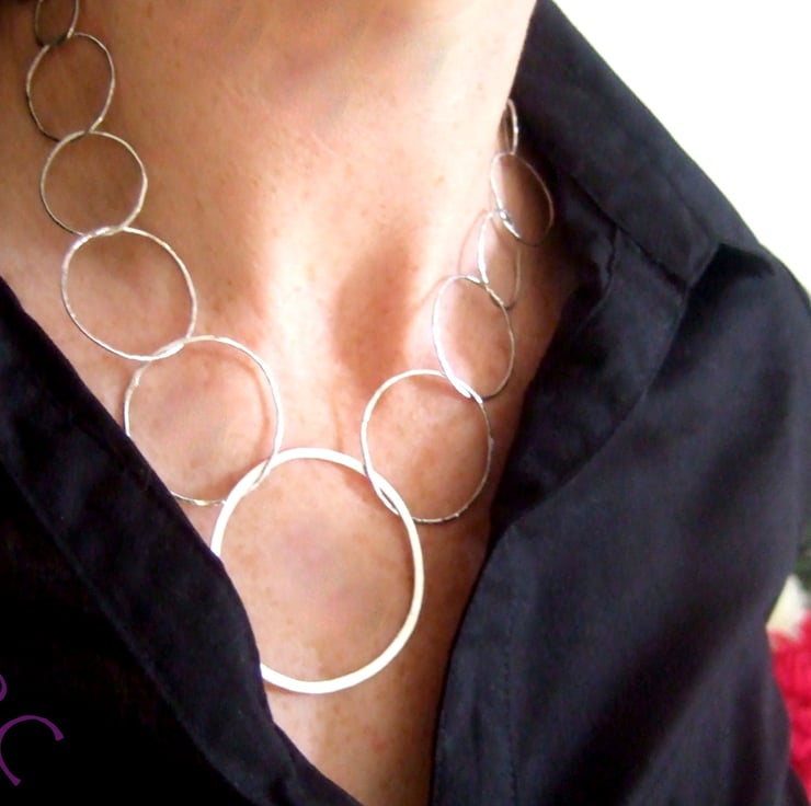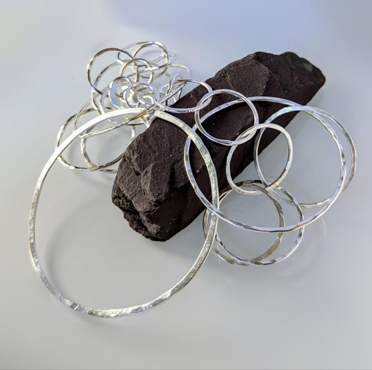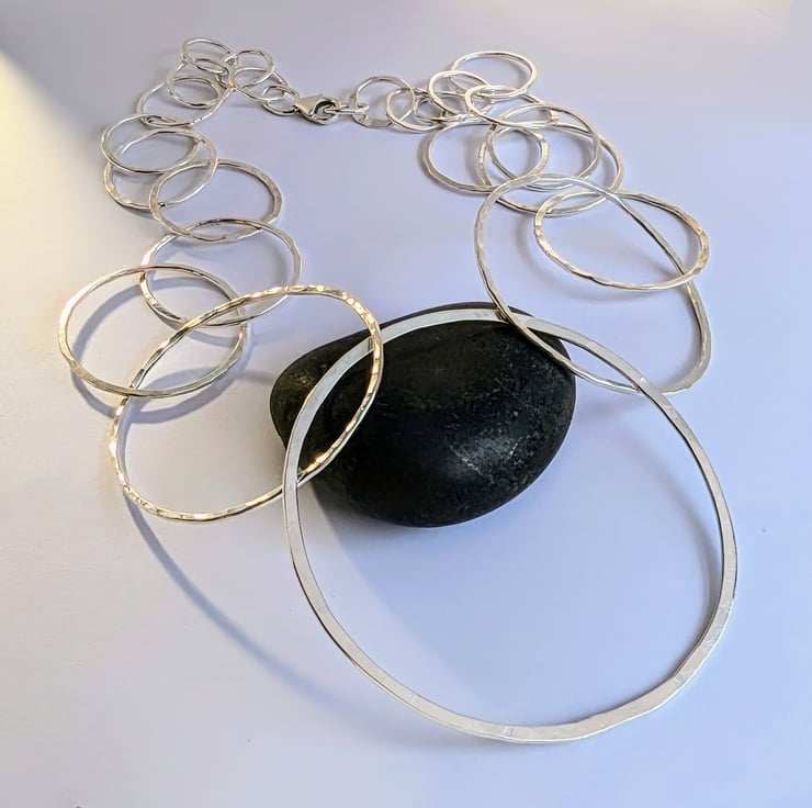 Softly hammered hoop necklace. hoops. Large hoop is 50 mm diameter and hammered flat using the flat end of the hammer the other hoops have been hammered with the round end of the hammer giving the hoops texture and strength.