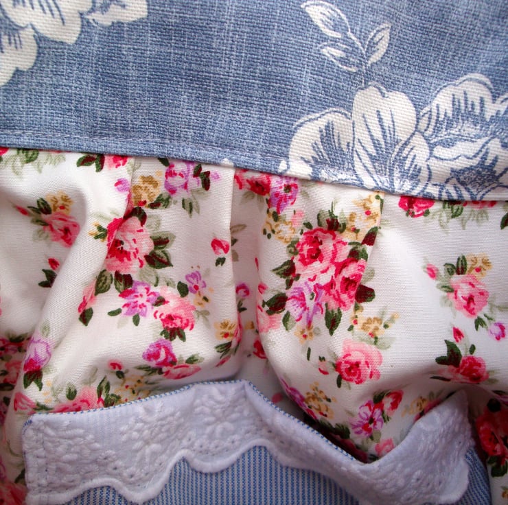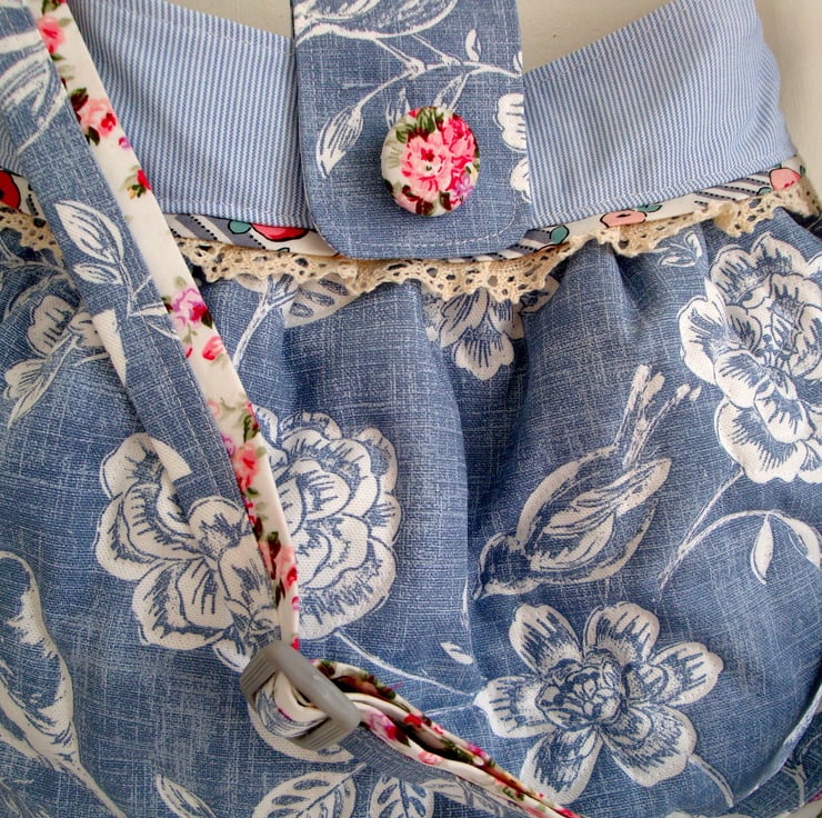 Handmade in a lovely printed cotton decor fabric ( faded denim colour ) , lower front and back has been lightly padded and quilted . A lovely floral cotton trim and lace has been inserted in yoke seams front and back . ( Lace trim on front only )