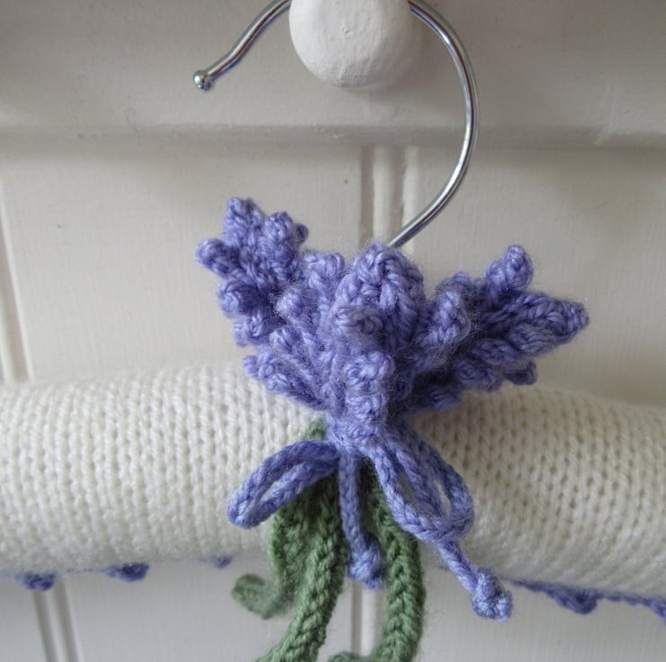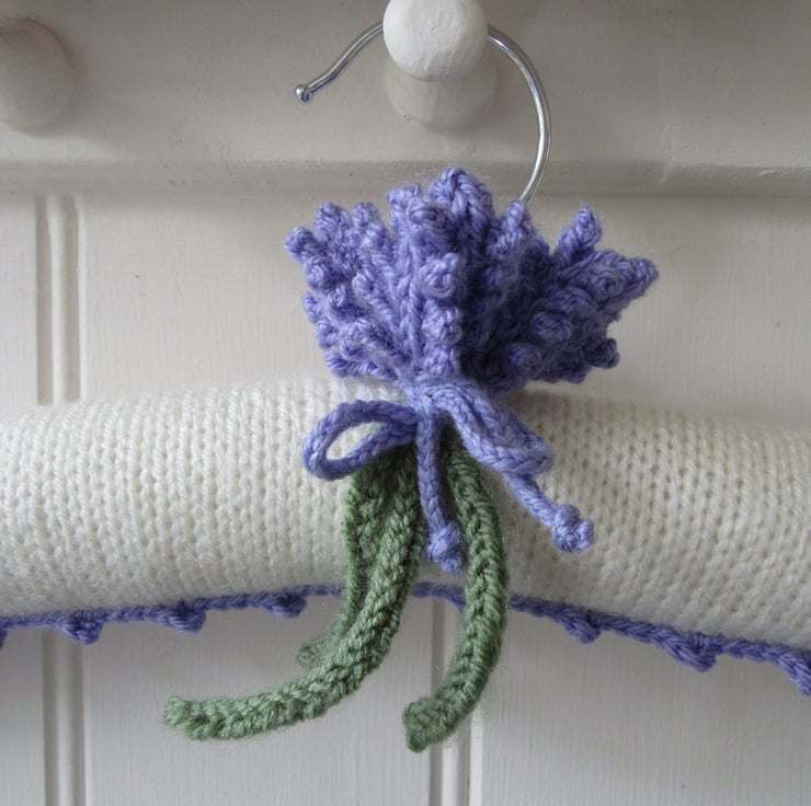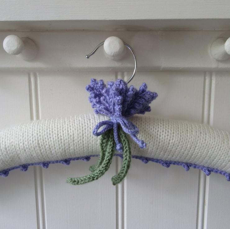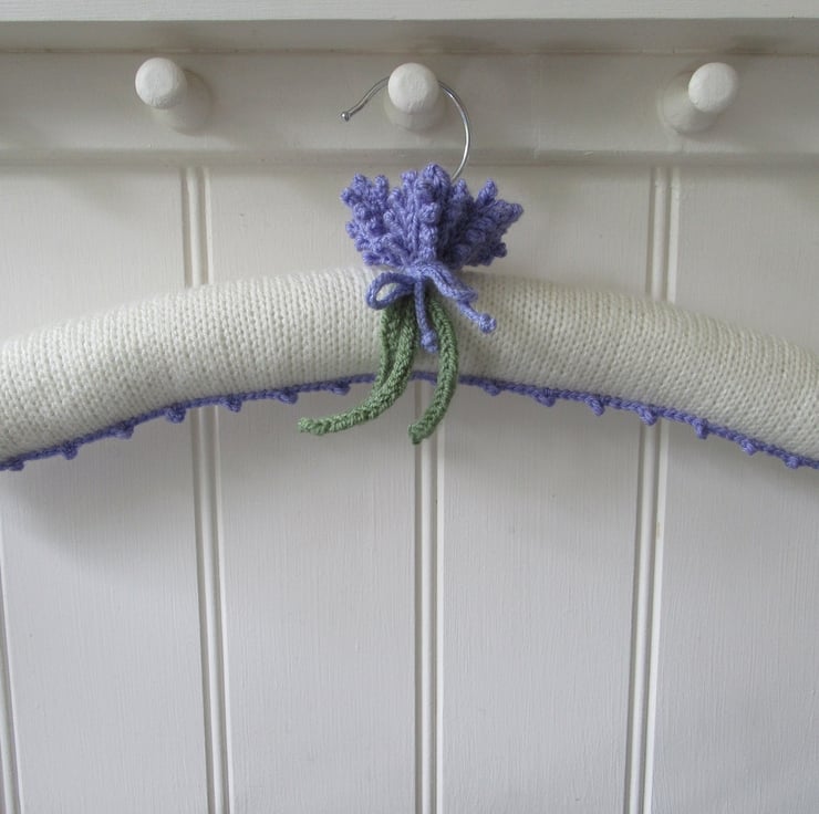 Ladies hand knitted and padded coat hanger. The wooden base is wrapped in wadding giving a well rounded hanger which is surrounded with a cream knitted cover, the bottom edge is closed with a lavender coloured crochet picot edging. Under the metal hook there are 3 sprigs of knitted lavender flower heads, with leaf green handmade cord stems, all tied together with a contrast coloured cord.
