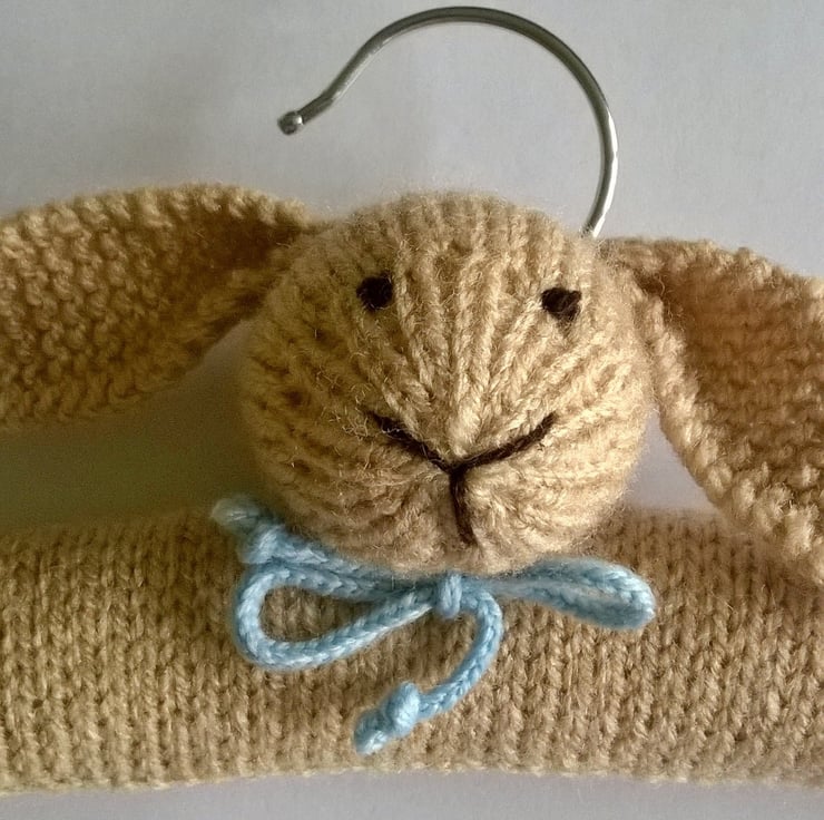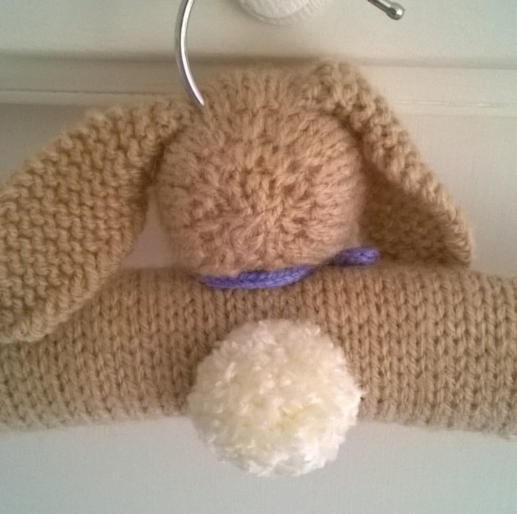 A beautiful hand knitted bunny rabbit childrens clothes hanger. The cover is hand knitted with a delicious vanilla fudge coloured acrylic yarn. The sweetest bunny head with ever so long rabbit ears, is carefully secured over the metal hook. It has the fluffiest cream pompom tail securely sewn to the back. A cord bow tie around its neck can come in any colour, please state when ordering. The wooden hanger is wrapped wadding which gives a lovely padded feel and look to the hanger. I have also knitted a bear and sheep clothes hanger - make a set and give all three! This hanger would make a wonderful Christening/baptism gift. This bunny clothes hanger features in the Folksy sewing gift guide.