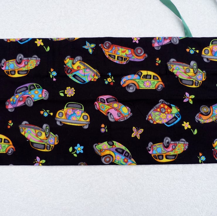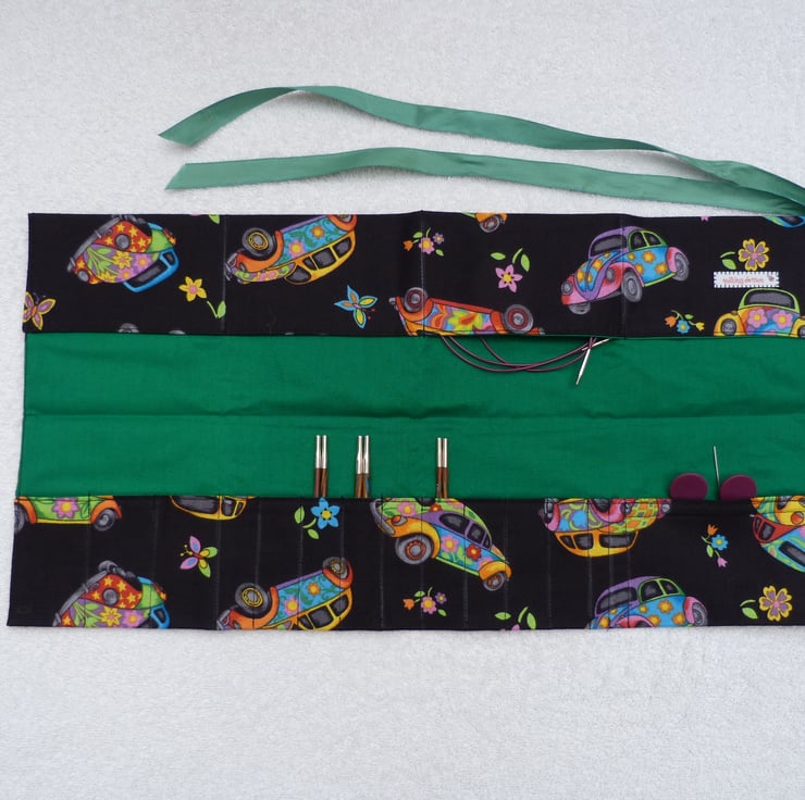 I have designed and created this useful interchangeable knitting needle organiser to keep all your detachable needles and cables safe. The holder is made from a 100% cotton outer, and lined with a complimentary plain cotton fabric. Interfacing has been used to give the holder structure and shape.