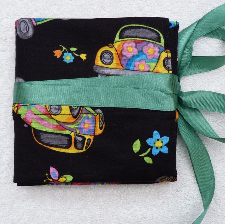 The case folds over in half to keep the needles safe, and then folds again, before securing with a satin ribbon. It is top stitched to achieve a professional finish. Total size when placed out flat is 20" x 10". The holder measures 5" x 5" x 1" when folded.