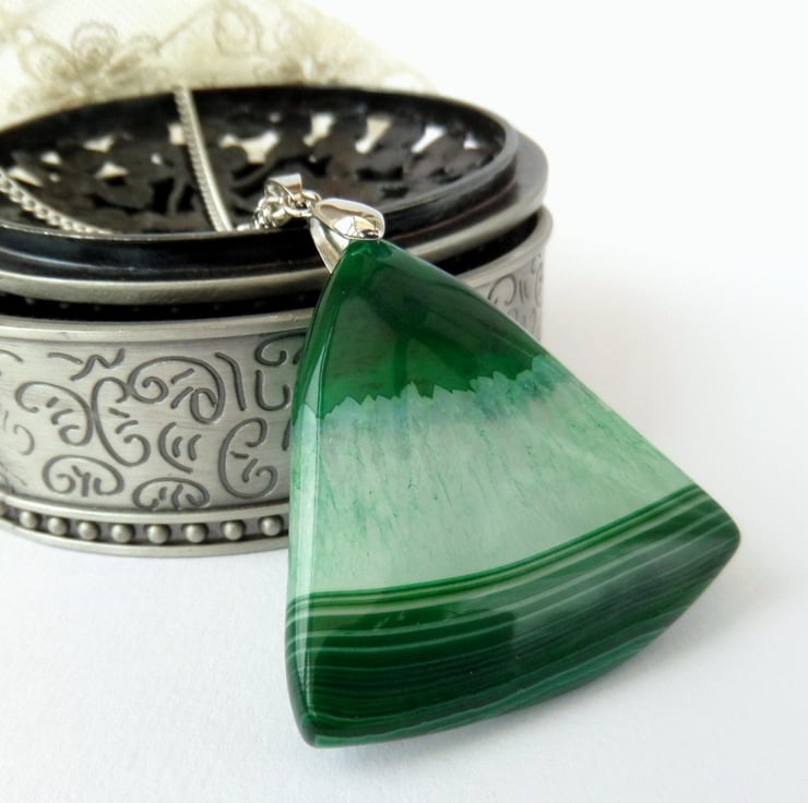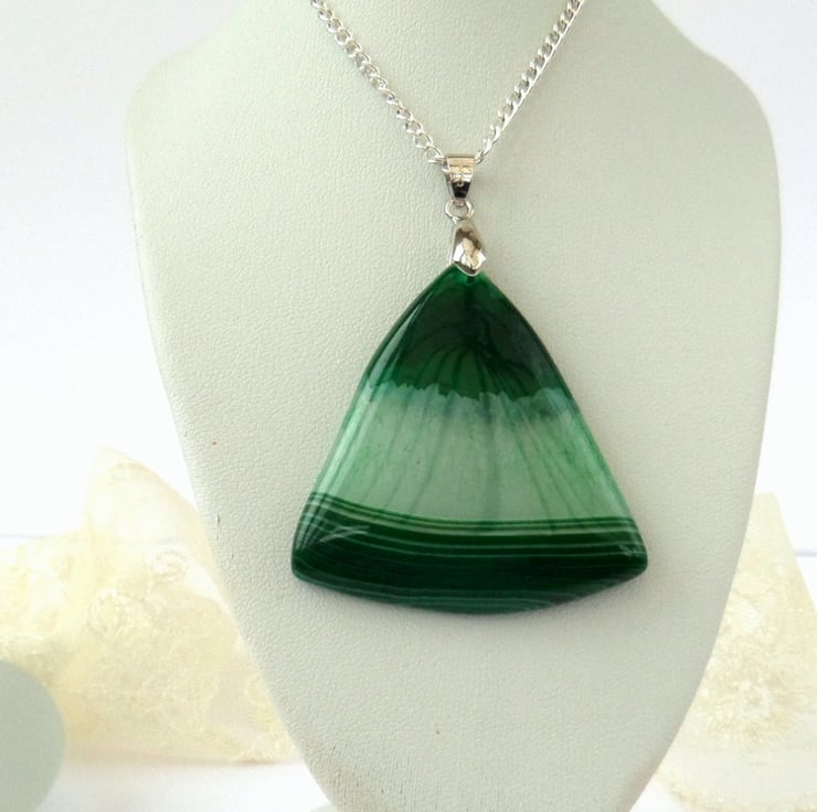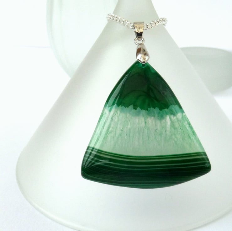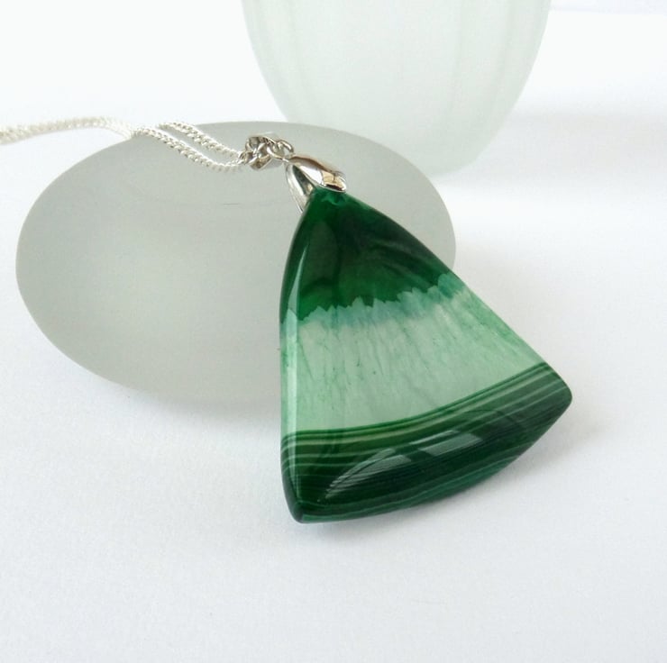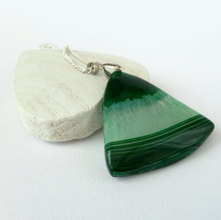 A beautiful triangular banded agate pendant necklace in lovely fresh shades of green.