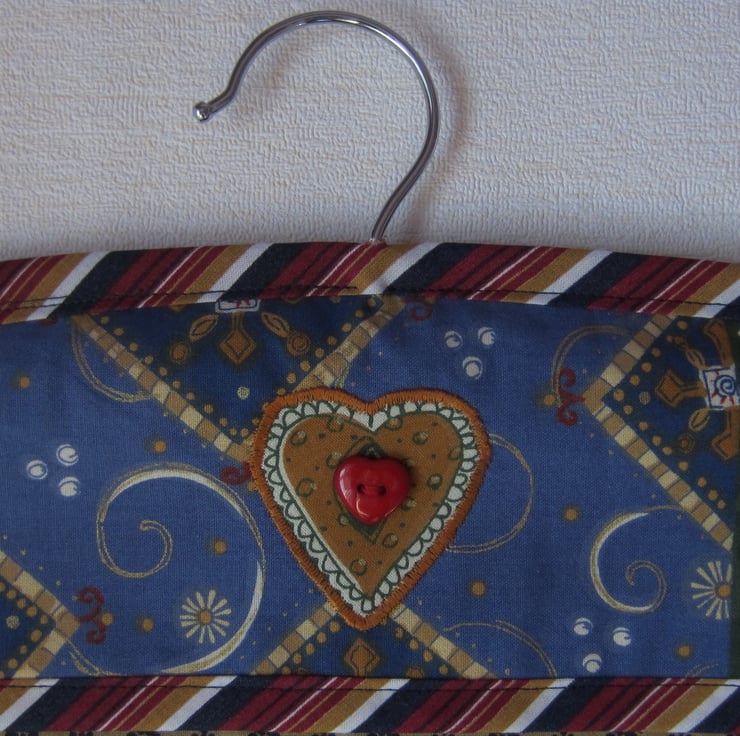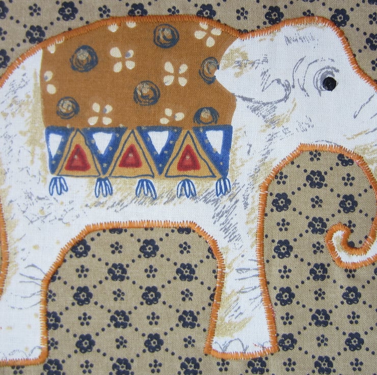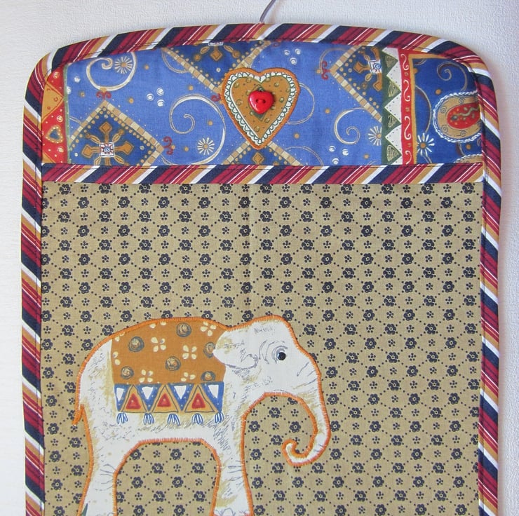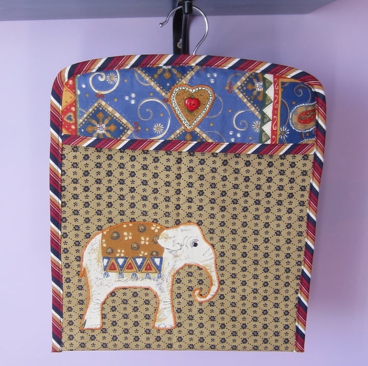 Sturdy peg bag decorated with an appliqued elephant and heart. The elephant has a black sequin eye and the heart also has an added red heart button. Plenty of room for lots of pegs or use for other storage such as tights, socks, lingerie etc. It measures 30 x 34.5 cm and is lined with cream fabric. Hangs with a strong wooden coat hanger.