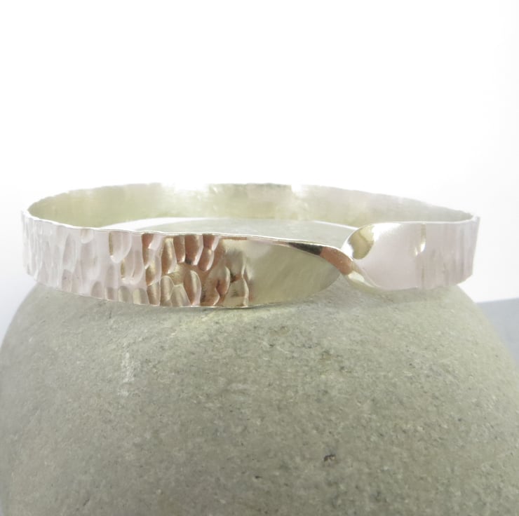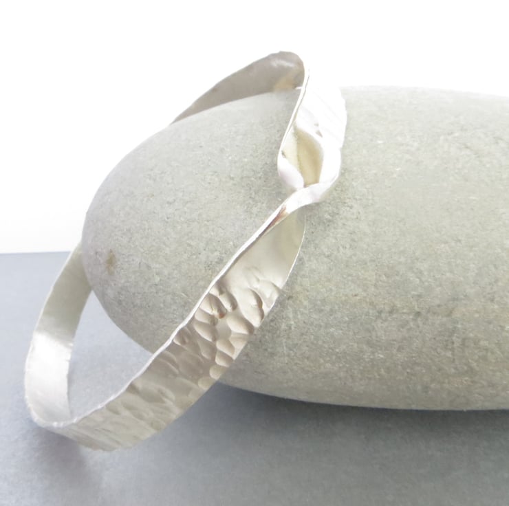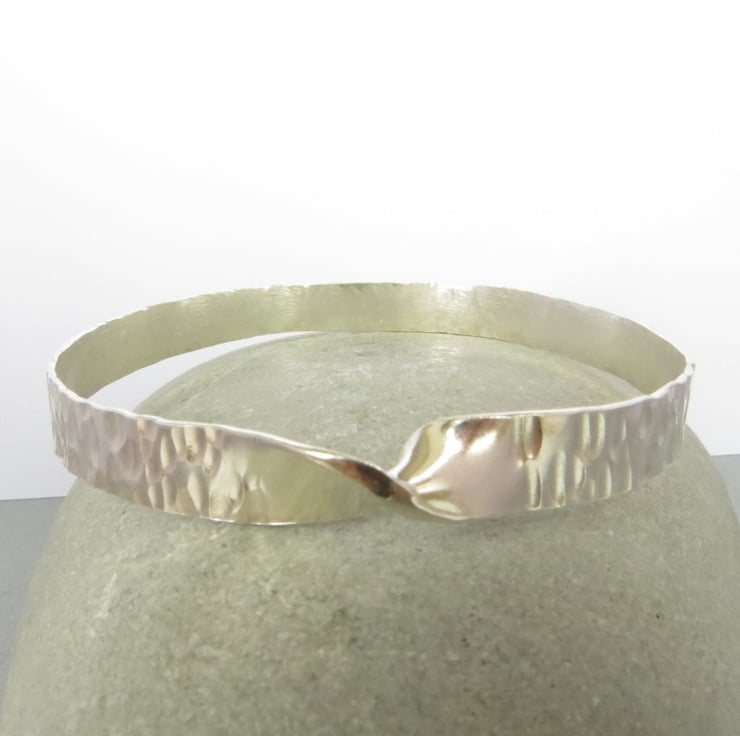 This silver mobius bangle has been made using traditional silversmithing techniques: a single twist has been put in the silver before soldering to form a single surface that only has one side and one edge. It has been hammer textured to give it an interesting line detail which is reminiscent of tree bark. Polished to a high shine, this bangle catches the light and is sure to get you noticed!