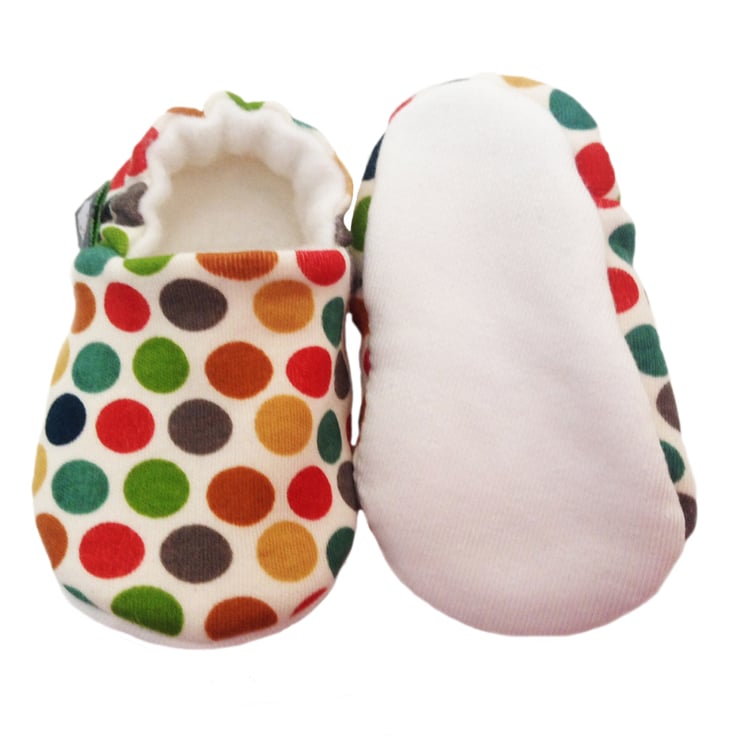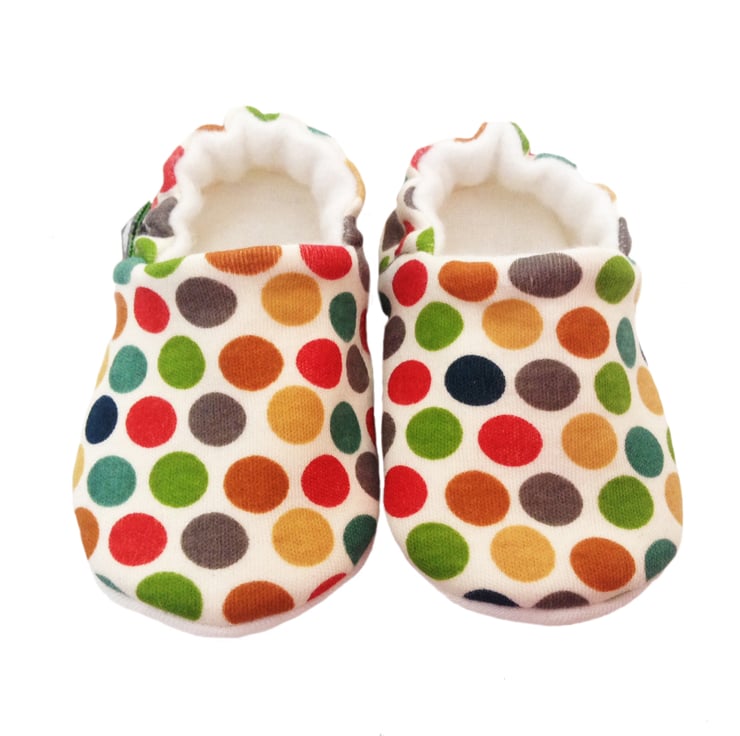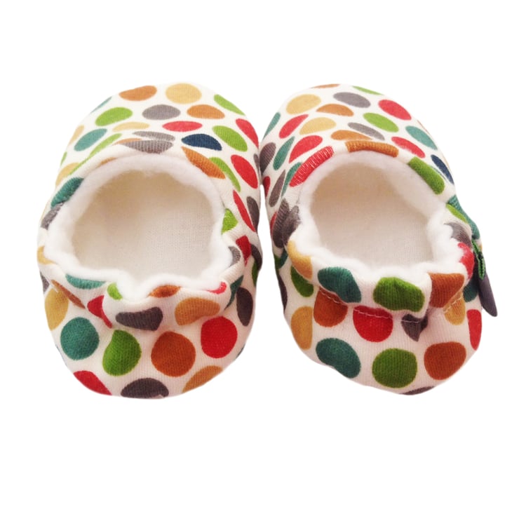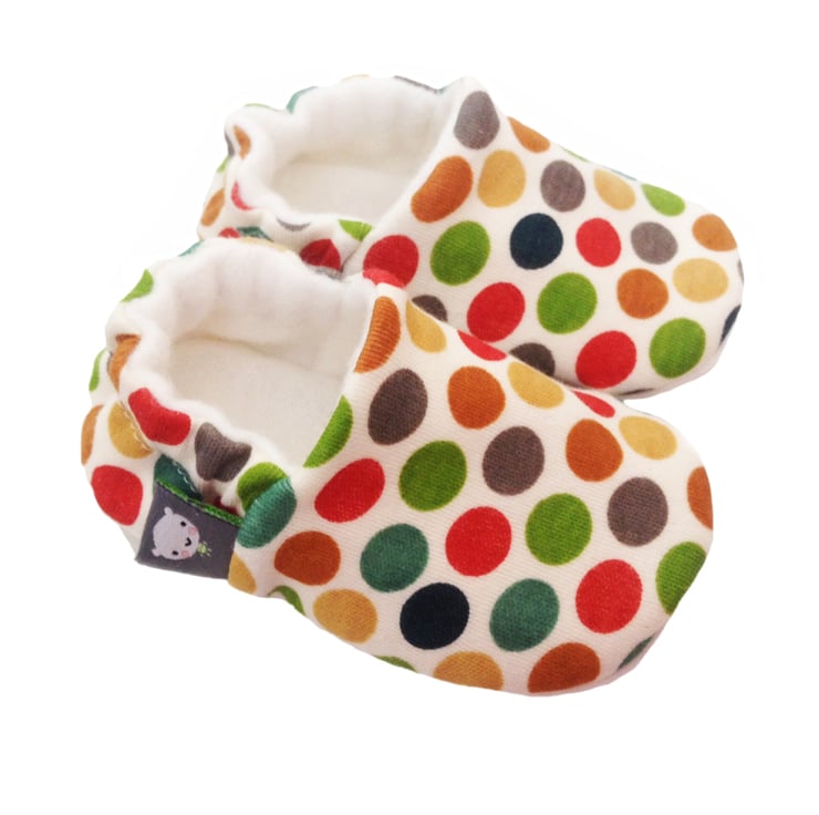 ORGANIC SHOES in an ultra cute multi-coloured DOTTIE print. The Pram Shoes outer are made from 100% Certified ORGANIC Cotton Knit (GOTS) which is printed with low impact dyes and kind to skin. Fully lined with NO raw edges in a luxurious organic bamboo cotton & 100% organic cotton lining with elasticated heel - ensuring comfort for your little one.