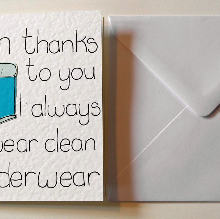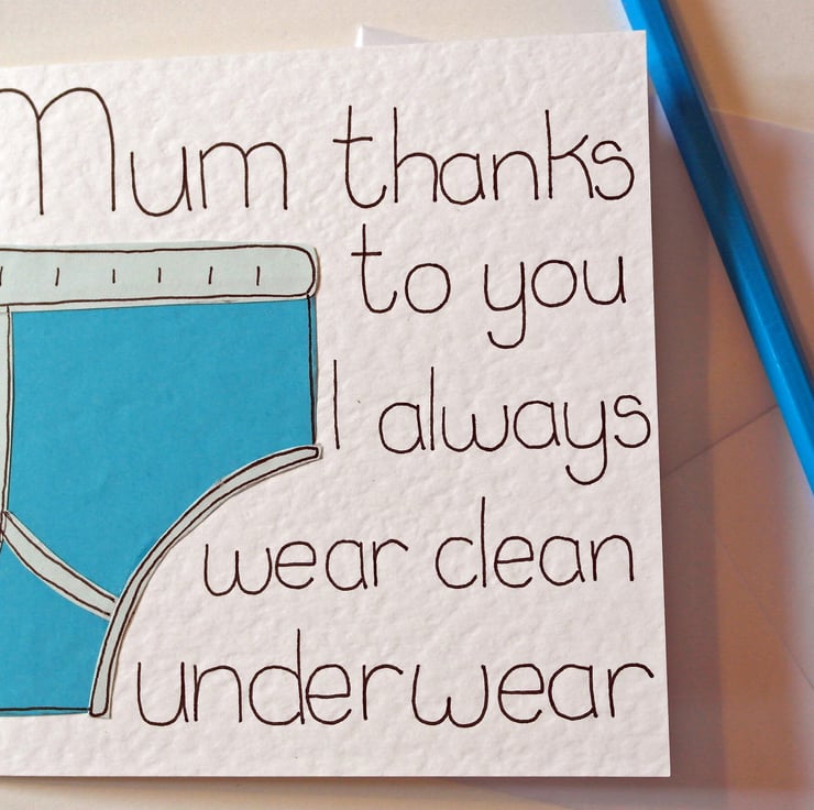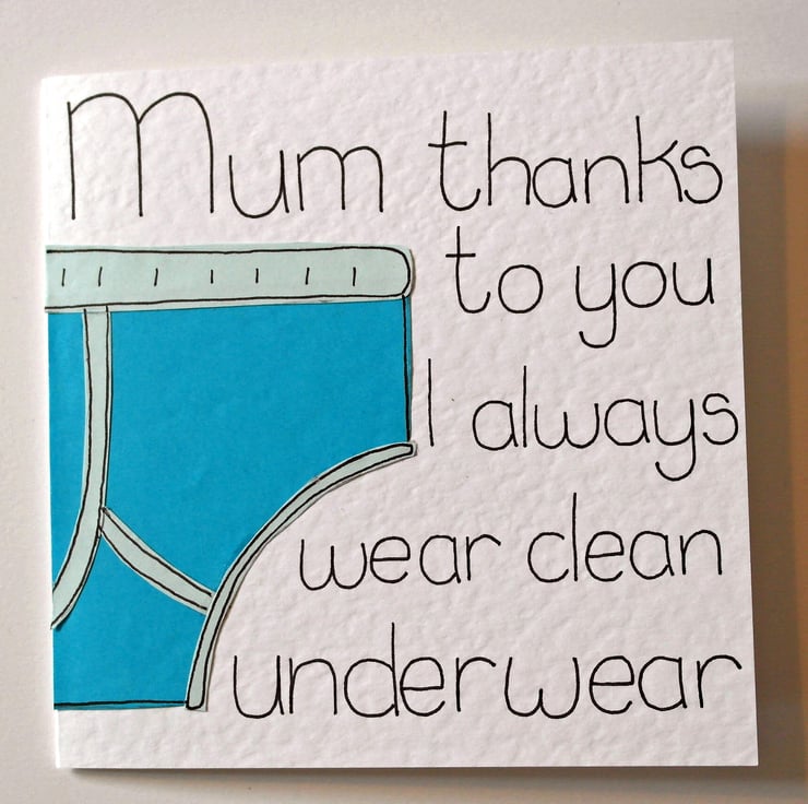 A funny card to send to your mum on her birthday or Mother's day. You could even just send it to make her smile! Remember when your Mum said to you always wear clean underwear in case you get in an accident. Now you can let her know that you follow that great advice every day, great for a son to send to his Mum to let her know he was listening.
